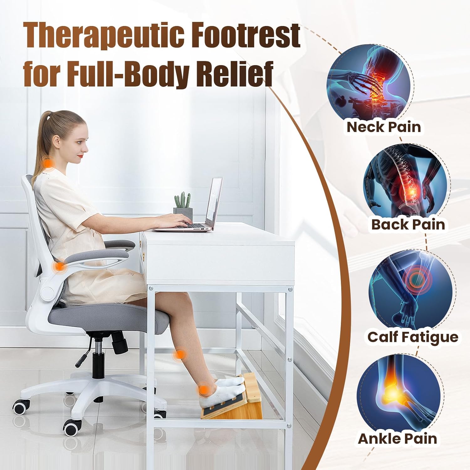 - Therapeutic Benefits for Foot, Calf, and Back Pain Relief: This ergonomic footrest doubles as a calf stretcher, providing physical therapy benefits for those suffering from plantar fasciitis, Achilles tendonitis, calf muscle strains, and hip bursitis. A great choice for improving circulation and flexibility through gentle incline stretches.