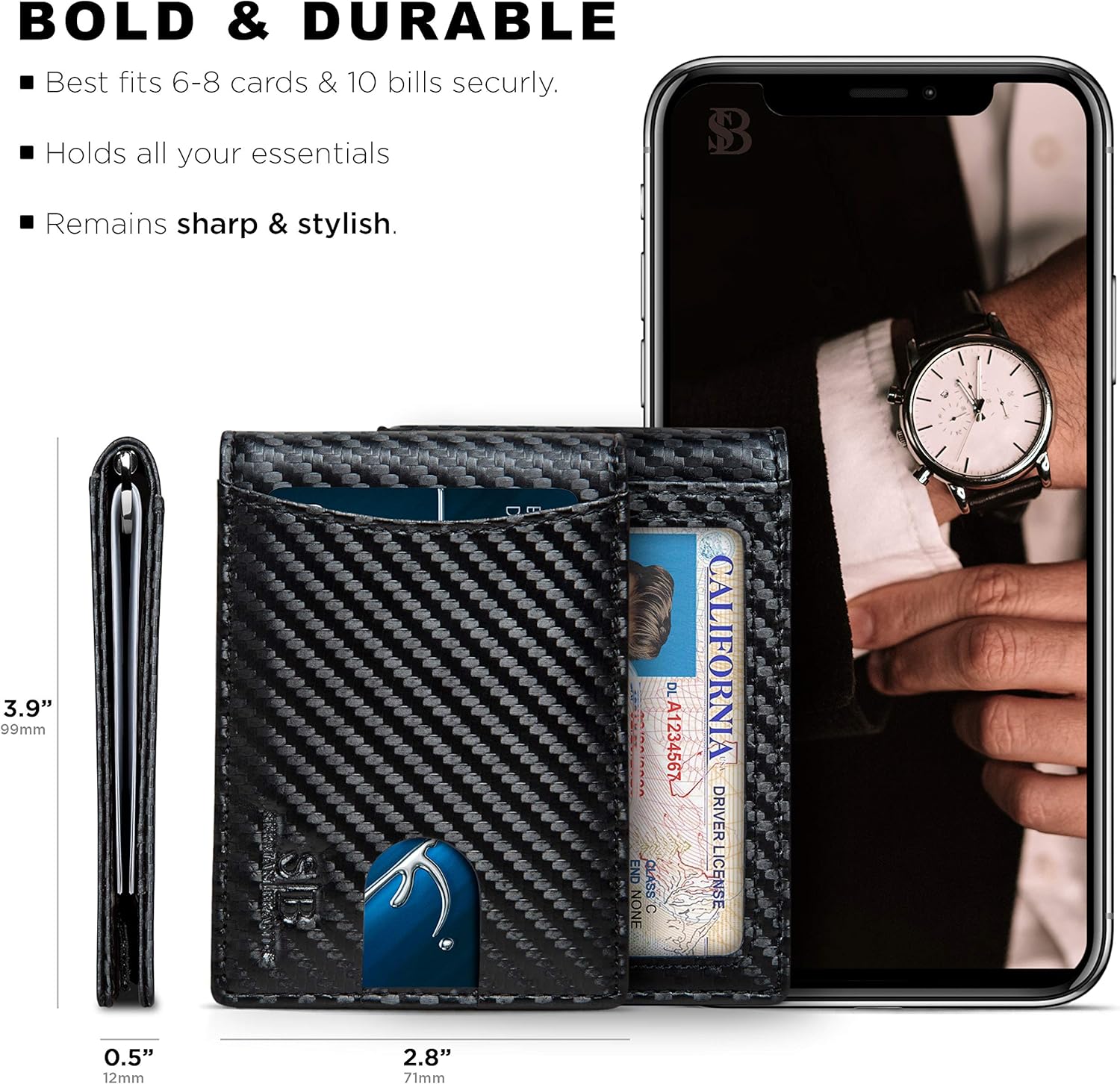 - SLIM AND STYLISH - Made with the Finest Full Grain leather, Top Grain Leather and Vegan Leather. Designed Quick Access ID Windows, Best Fits 6-8 cards plus US bills with no bulk, and a minimal Pull-tab design to reduce bulk - Wallet Size: 3.9" in. x 2.8" in. .5" in.