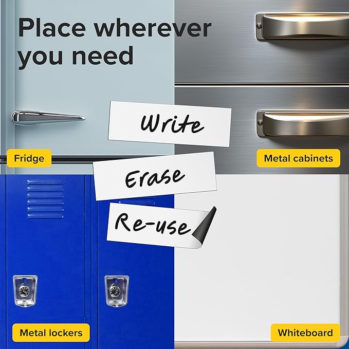 - EASY TO INSTALL and REUSABLE writable magnetic accents stickers. Write on them with a dry erase marker, wipe them off and use them again. Dry erase magnetic tape use for labeling storage shelves, labeling cabinets, whiteboards, magnet labels on the refrigerator, toolboxes, teaching aids, message boards, stockroom shelf labels, menu boards, planning boards, file cabinets, refrigerators, retail signs, and every other magnetic surface