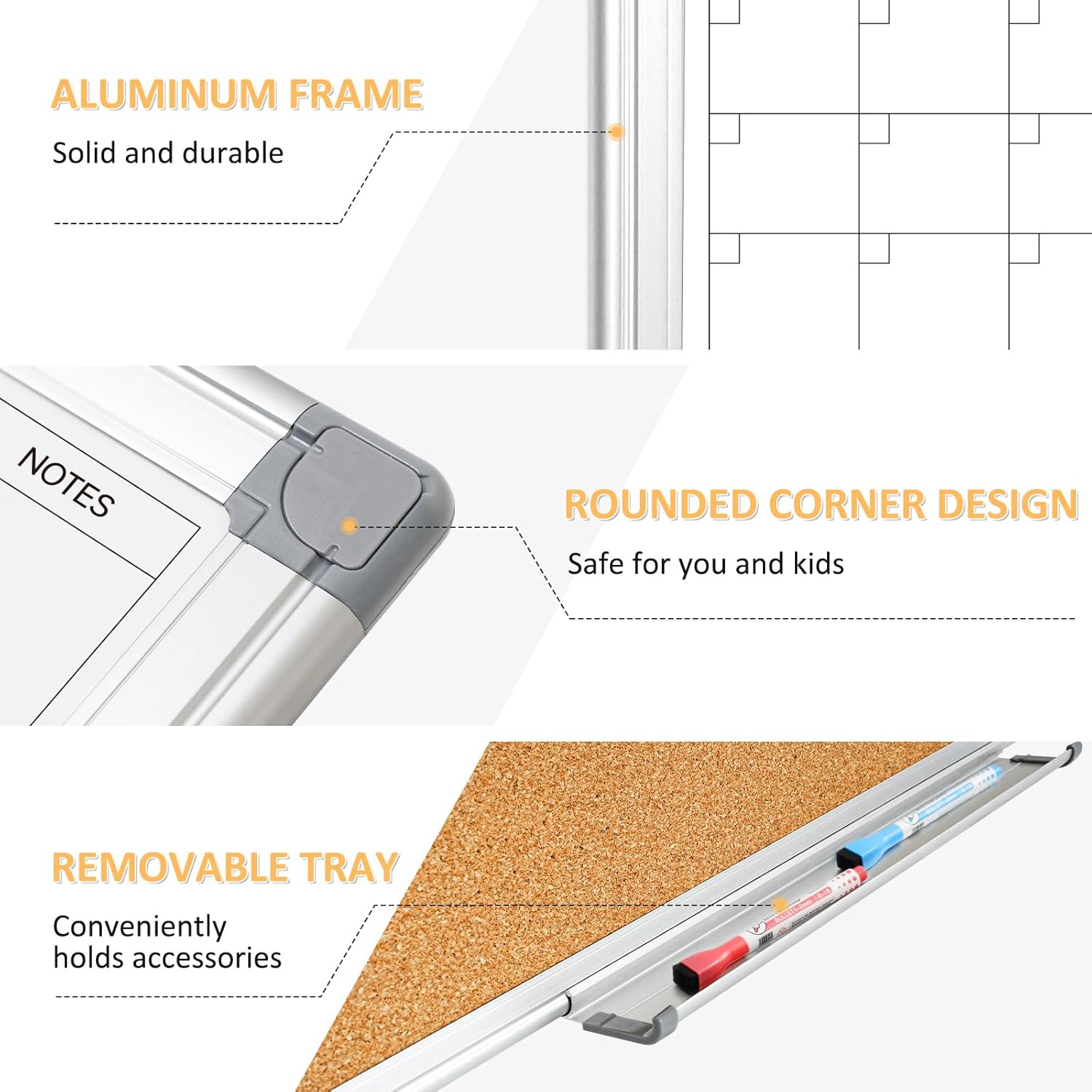 - 【3-in-1 Double-sided Board 】Our board has two sides: one side is a blank whiteboard, the other is a monthly dry erase calendar + corkboard. More writing space allows you to handle more projects - track of bills, events, dates, plans, reminders, tasks or to-do list. The cork board is perfect for photos, notes, messages, or other decors as you like. Versatile use. Great as a gift!