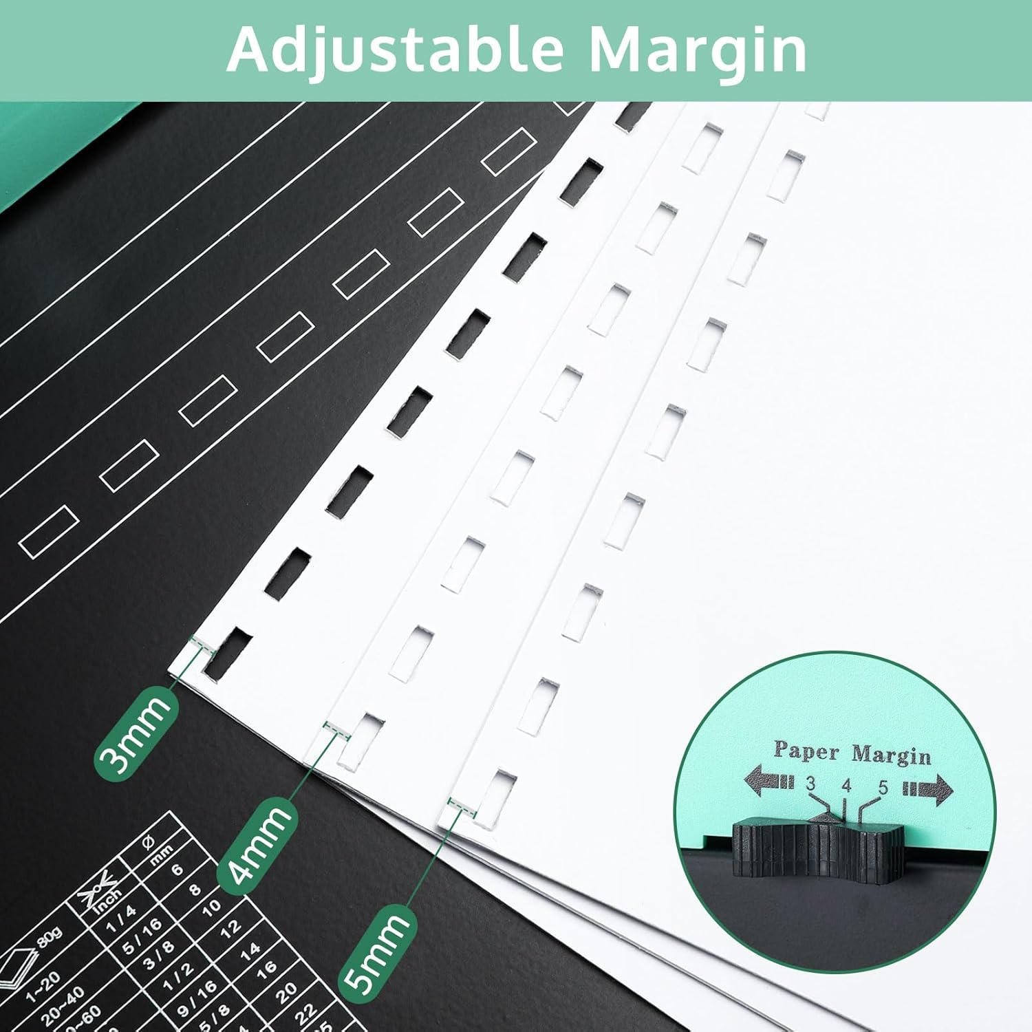 - 【Precise Punch Alignment】Equipped with a positioning knob and adjustable edge guide, our book binder ensures accurate alignment for Letter, A4, and A5 sizes. Easily customize the paper margin (3mm, 4mm, 5mm) for professional-looking documents every time.