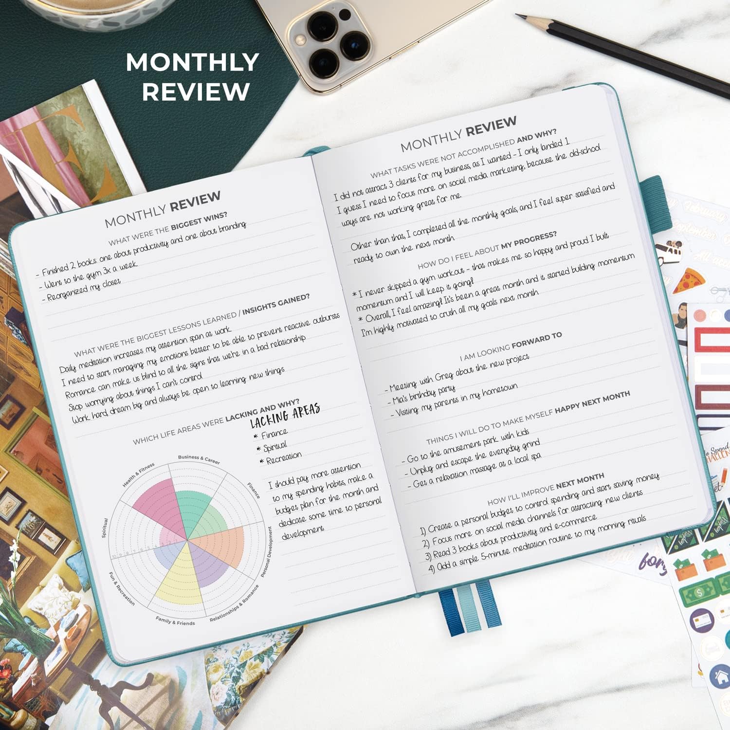 - ✓ PREMIUM EDITION GIFT BOX & STICKERS – This weekly planner comes in a gift box with 6 sheets of stickers and a user manual. It comes in A5 size, measures 5.8 by 8.3 inches, and has a premium vegan leather hardcover and thick 120gsm no-bleed paper.