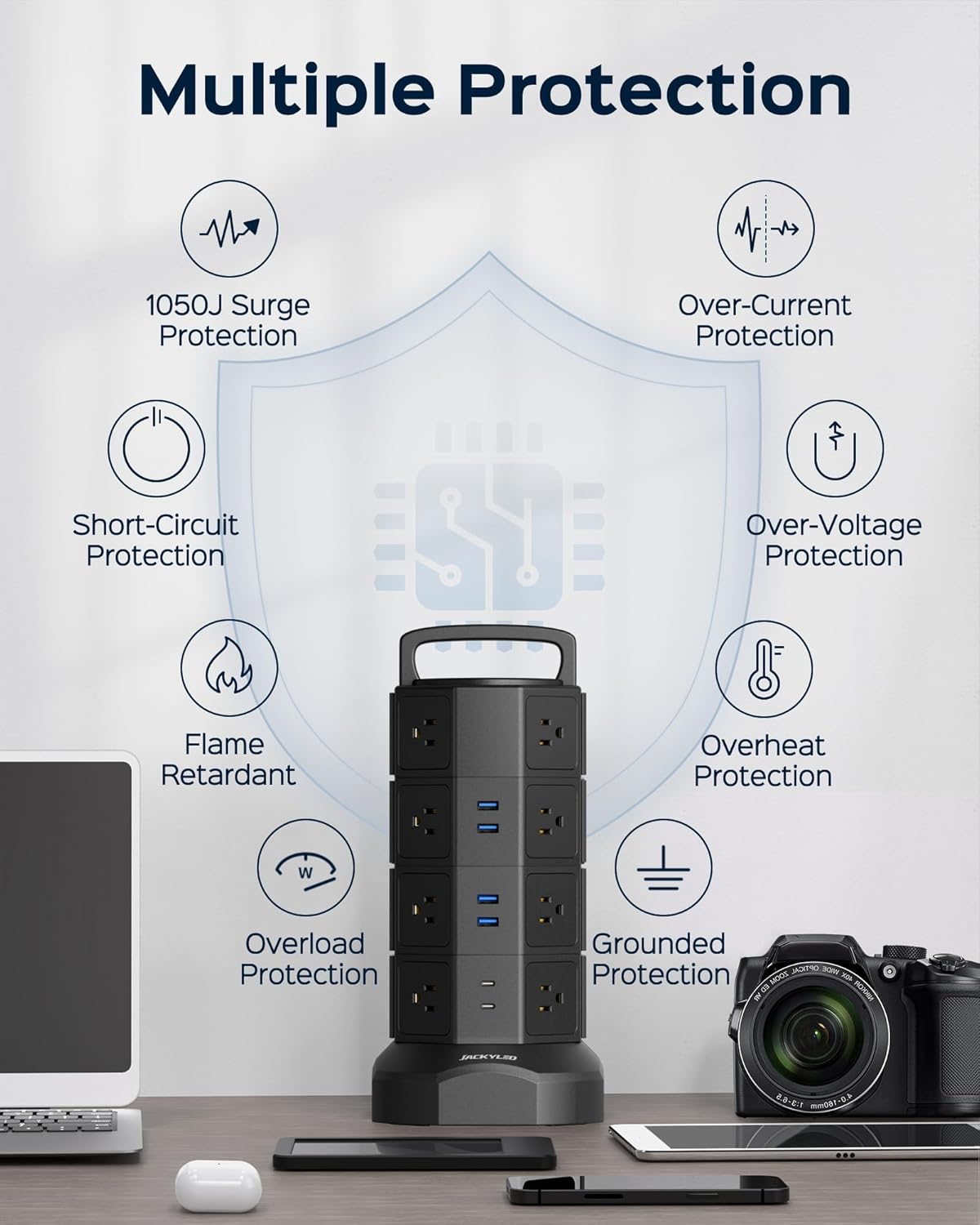 - ▶【2 USB-C & 4 USB-A Charging Ports】Tired of searching for adapters when the phone battery is low? With 2 USB-C ports and 4 USB-A ports, JACKYLED USB power strip tower is here to simplify your charging needs. The inbuilt smart charging technology empowers the USBs to intelligently detect your electronic devices and charge them at optimal yet safe speeds—compatible with most USB devices. (Total Output: 4.8A/24W Shared, USB-C: 5V⎓3A, USB-A: 5V⎓2.4A)