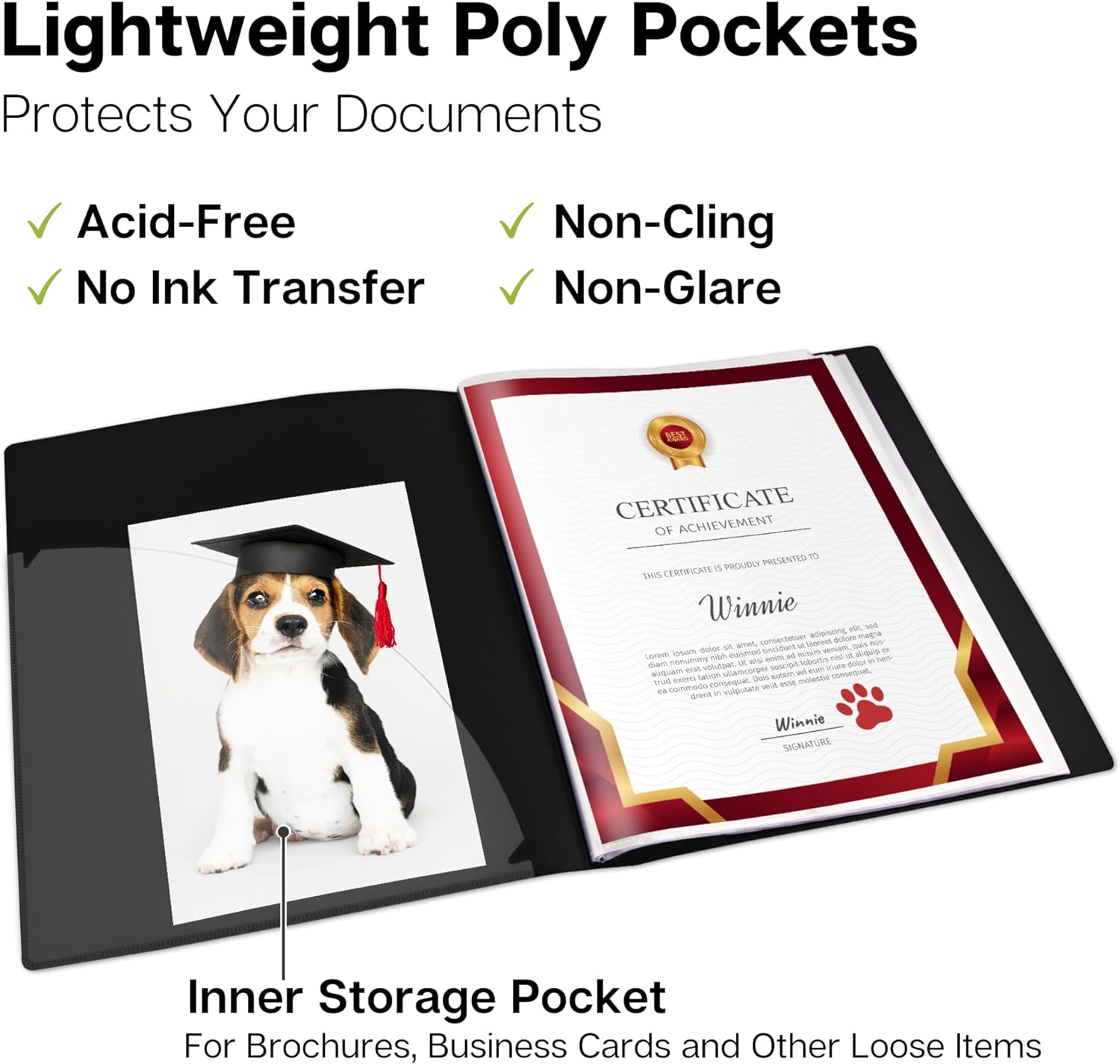 - DURABLE CONSTRUCTION, BUILT TO LAST: Premium plastic covers, reinforced binding resist tearing. Non-glare poly sleeves are dirt and moisture resistant, for a professional appearance every time.