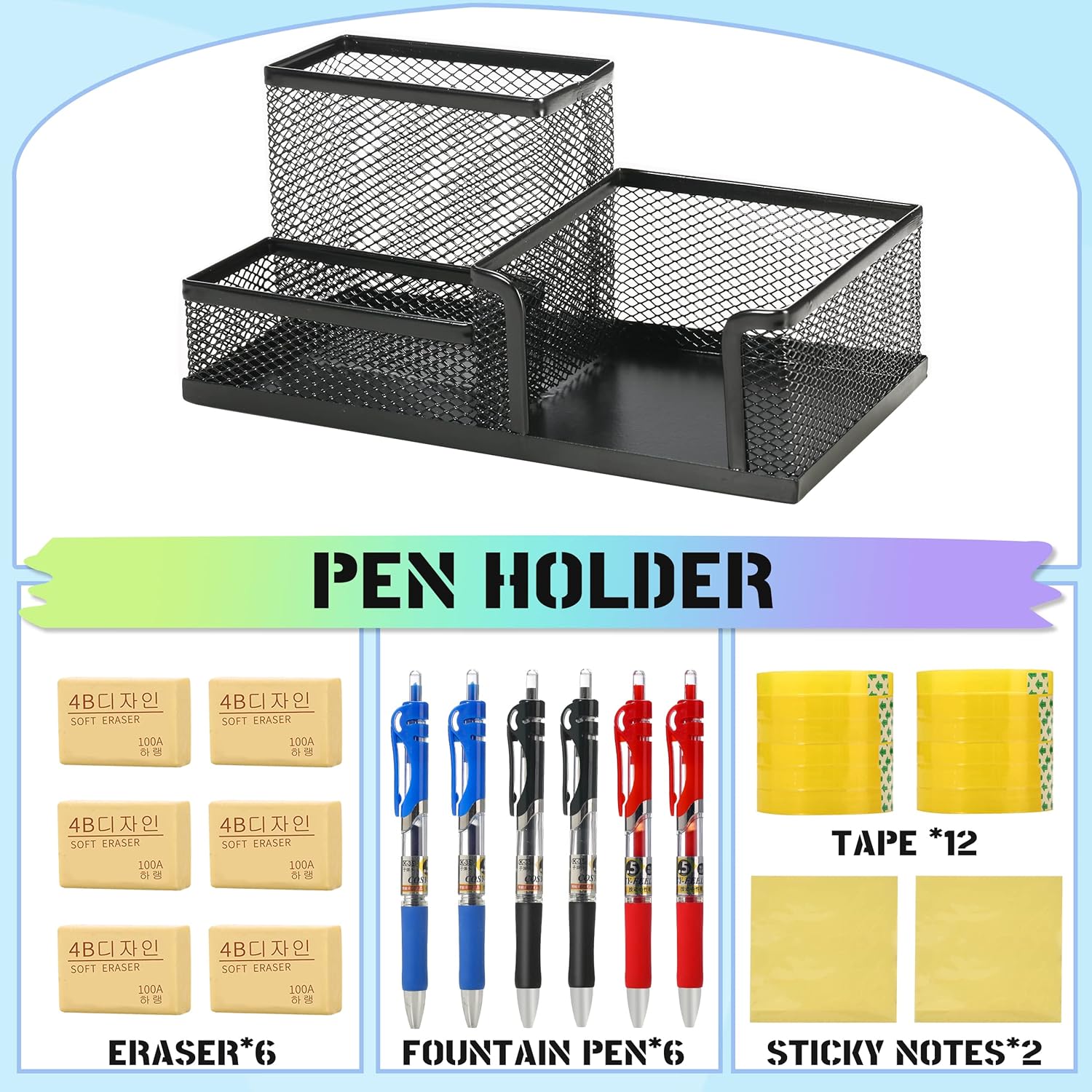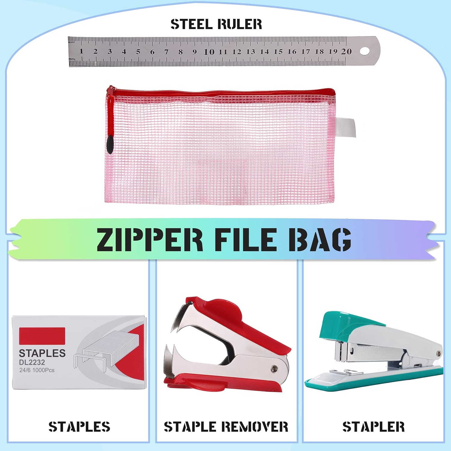 - Get organized with this stationery set containing 15 categories and 50 products for all your daily office and school needs, including pen holders, pens, notes, staplers, staple removers, scissors, utility knives, tape, and paper clips.