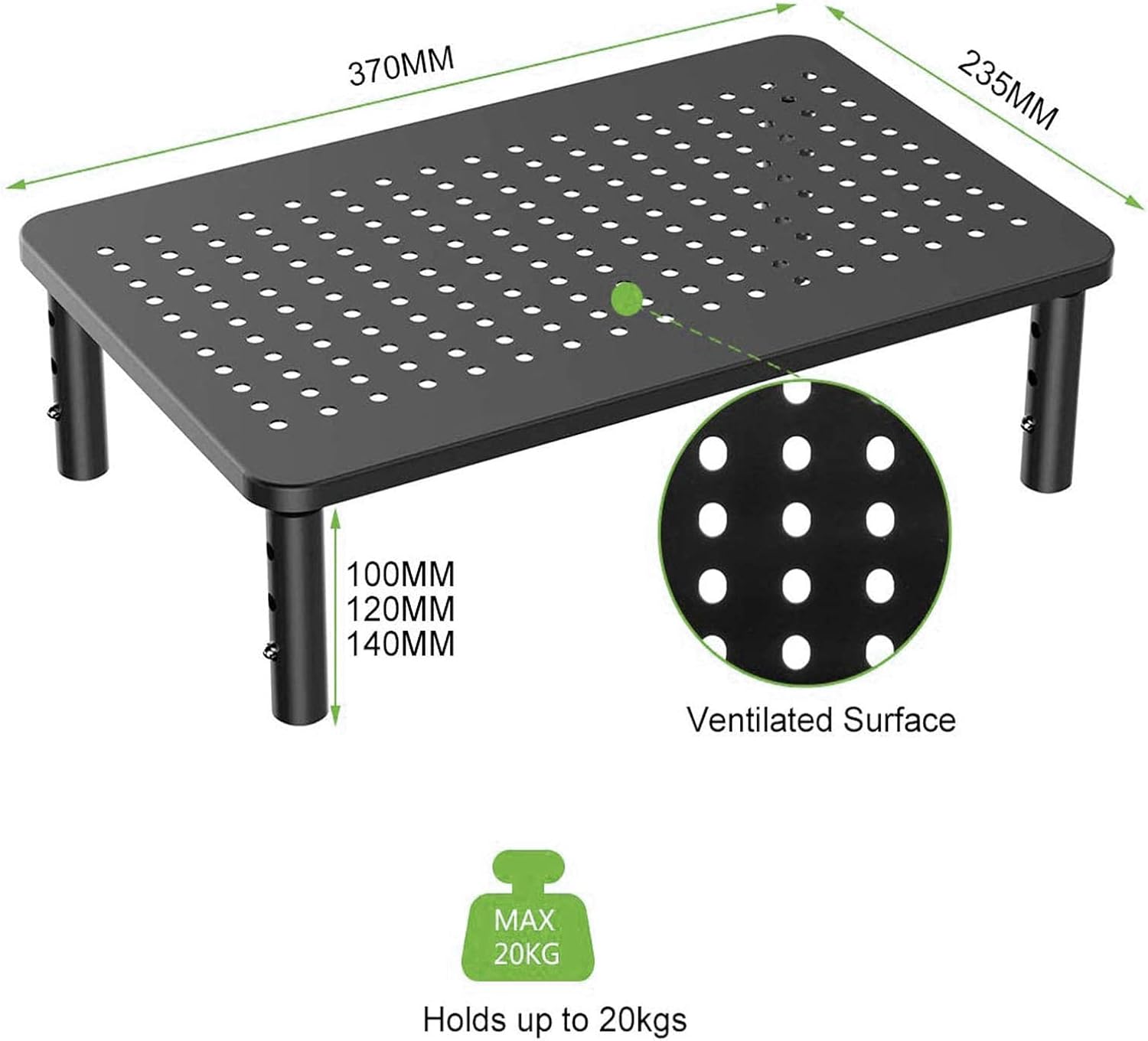 - 【3 HEIGHT ADJUSTMENT】- Comes With platform dimensions of 370X235MM (L x W) in size, this stand could raise your monitor by 3 adjustable height levels (100MM/120MM/140MM).maximize your desk space and keep your monitor at a proper height. allowing you to keep your screen at a comfortable eye-level height, effectively improve posture to relieve eyestrain. Just press the button on the leg and lift the platform to adjust different height levels.