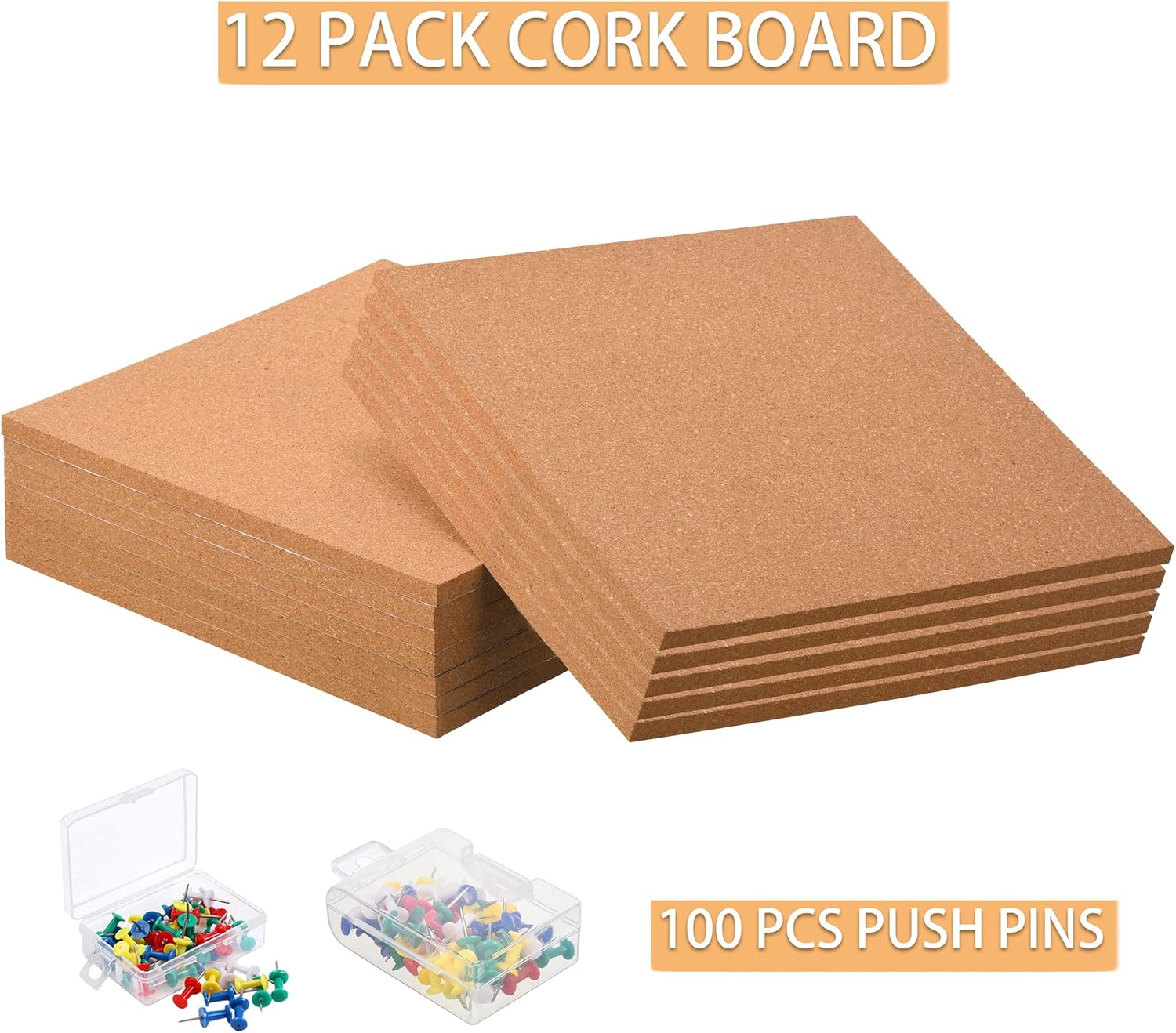 SUNGIFT Cork Board 12"x12" - 1/2" Thick Square Bulletin Boards 12 Pack Cork Tiles with 100 PCS Push Pins Mini Wall Self-Adhesive Corkboards Tiles for Wall