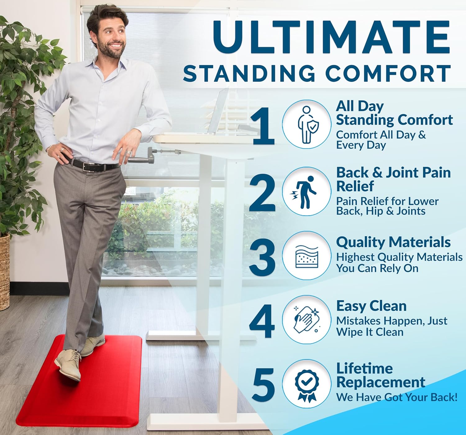 - Multi-use Floor Mat: The ComfiLife standing pad is exceptional for your office while standing at your desk, the kitchen while doing dishes, the laundry room while folding clothes and while working at your workbench. This kitchen rug will add comfort and style to your kitchen and provide lasting comfort and enhanced productivity wherever you stand.