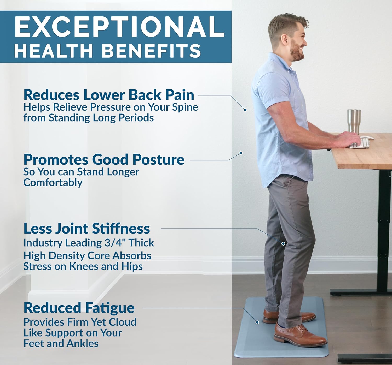 - The ComfiLife cushioned mat core is made of 3/4 thick, high-density foam that reduce discomfort on feet, knees, legs, and back while standing for an extended period