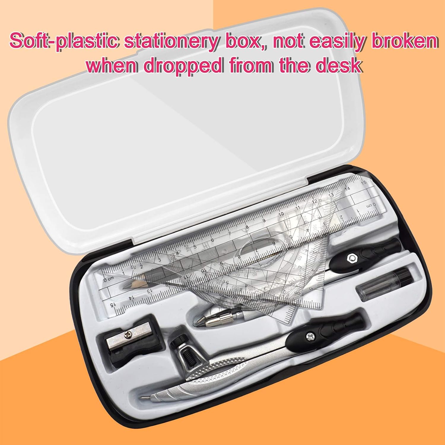 Professional Geometry Compass Set, Starter Compass Set Includes 2 Drafting Compasses, Protractor, 2 Set Squares, Ruler in Storage Box, Back-to-School Math Supplies for Students, Black