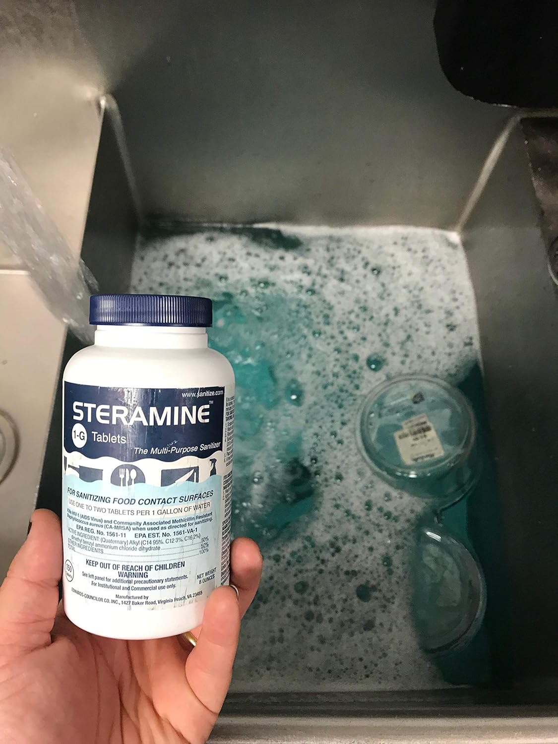 - EASY-TO-USE AND EFFECTIVE SANITIZING TABLETS FOR COMMERCIAL AND FOOD SERVICE USE – Steramine sanitizing tablets offer a fast, convenient, and reliable solution for maintaining hygiene in restaurants, bars, cafes, commercial kitchens, catering operations, and food prep areas. Simply dissolve one tablet per gallon of water to create a powerful sanitizing solution, easily identified by its distinctive blue tint. Each bottle yields up to 150 gallons, making it an economical choice for high-traffic environments. Ideal for use in 3-compartment sinks, sanitizer buckets, and spray bottles.