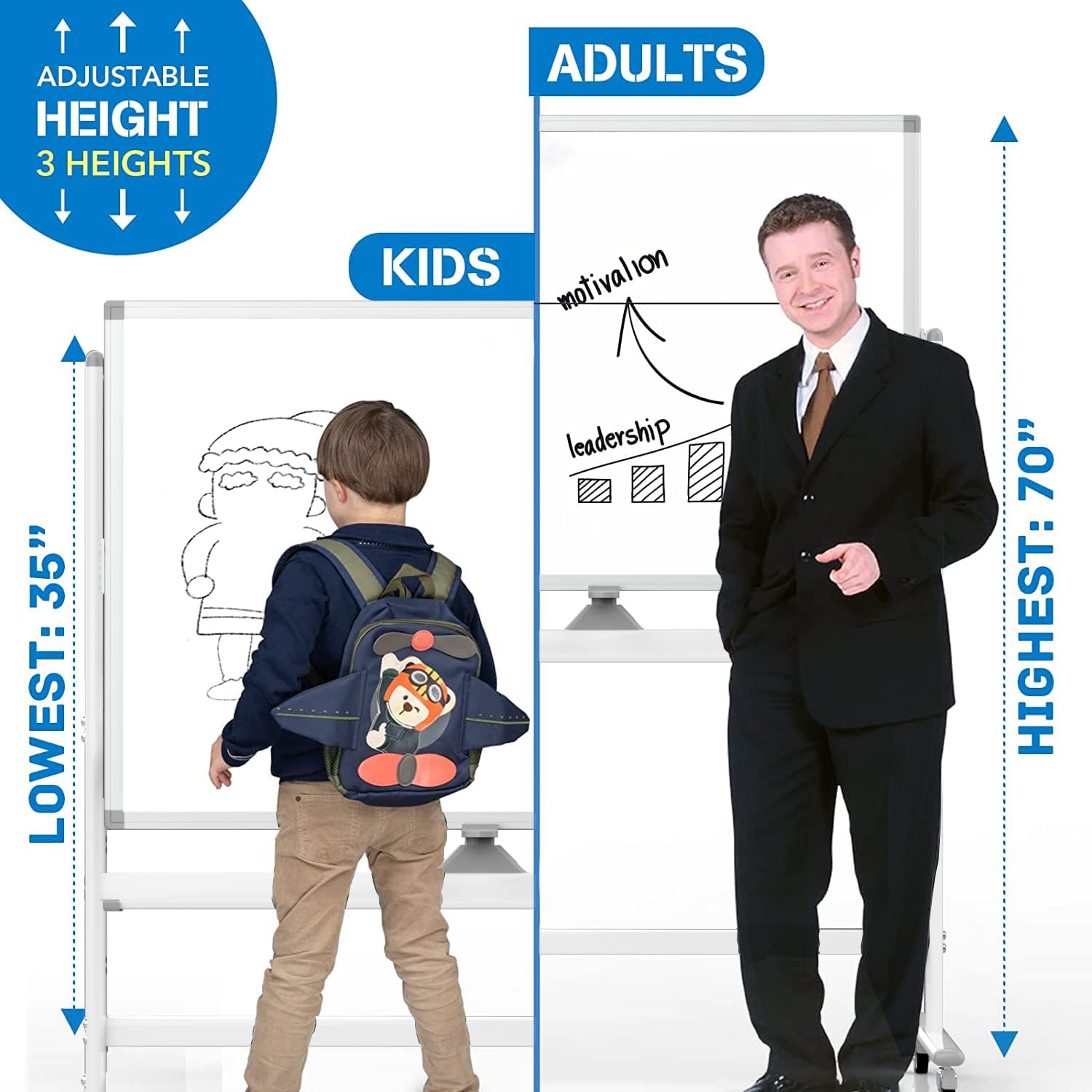- 【Double-Sided Mobile Whiteboard】The writing surface measures 48 inches x 36 inches, while the assembled frame dimensions are 52 x 50 inches. This reversible dry erase board features a button-activated flipping mechanism for maximum writing space utilization. Equipped with four durable 360-degree locking casters, it allows smooth mobility and secure placement.