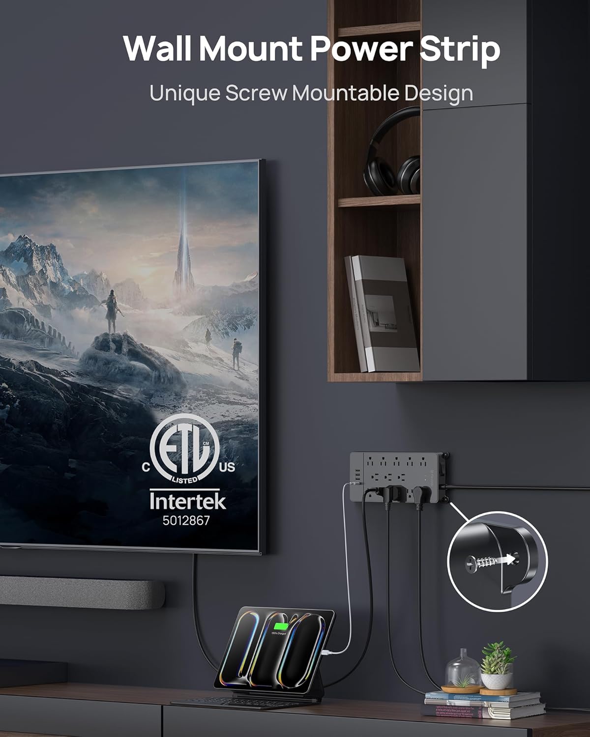 - Wall mountable design - 4 screw-mounting tabs allow you to securely install this surge protector power strip in various applications, including the entertainment center, behind the TV, dorm room, guest room, garage, desktop, under desk/counters, workbenches, etc.
