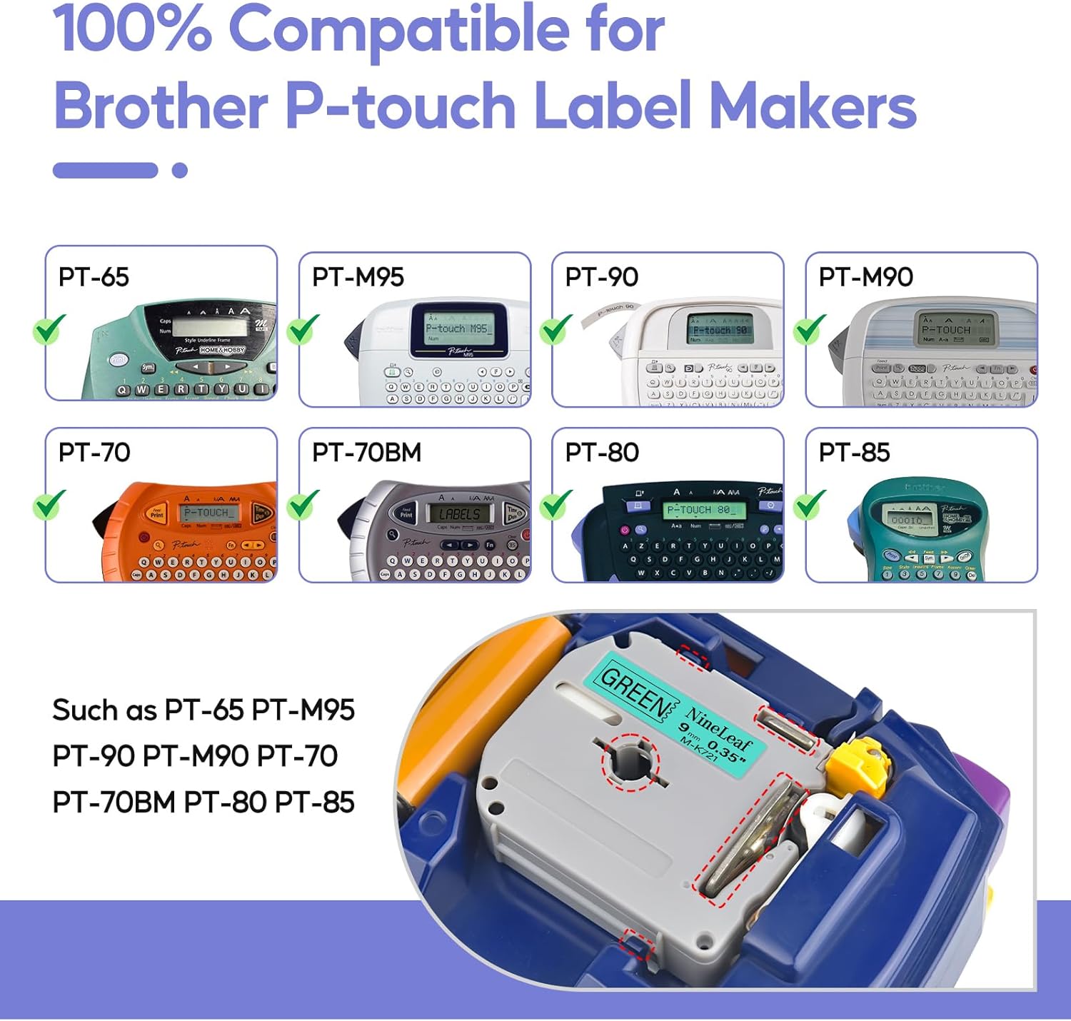 - NineLeaf 4 Pack Compatible for Brother P-touch Label Tape MK721 M-K721 M721 M-721 MK-721 Non-Laminated Label Tape, Color:(Black on Green), Length:8m(26.2ft), Width:9mm(0.35")