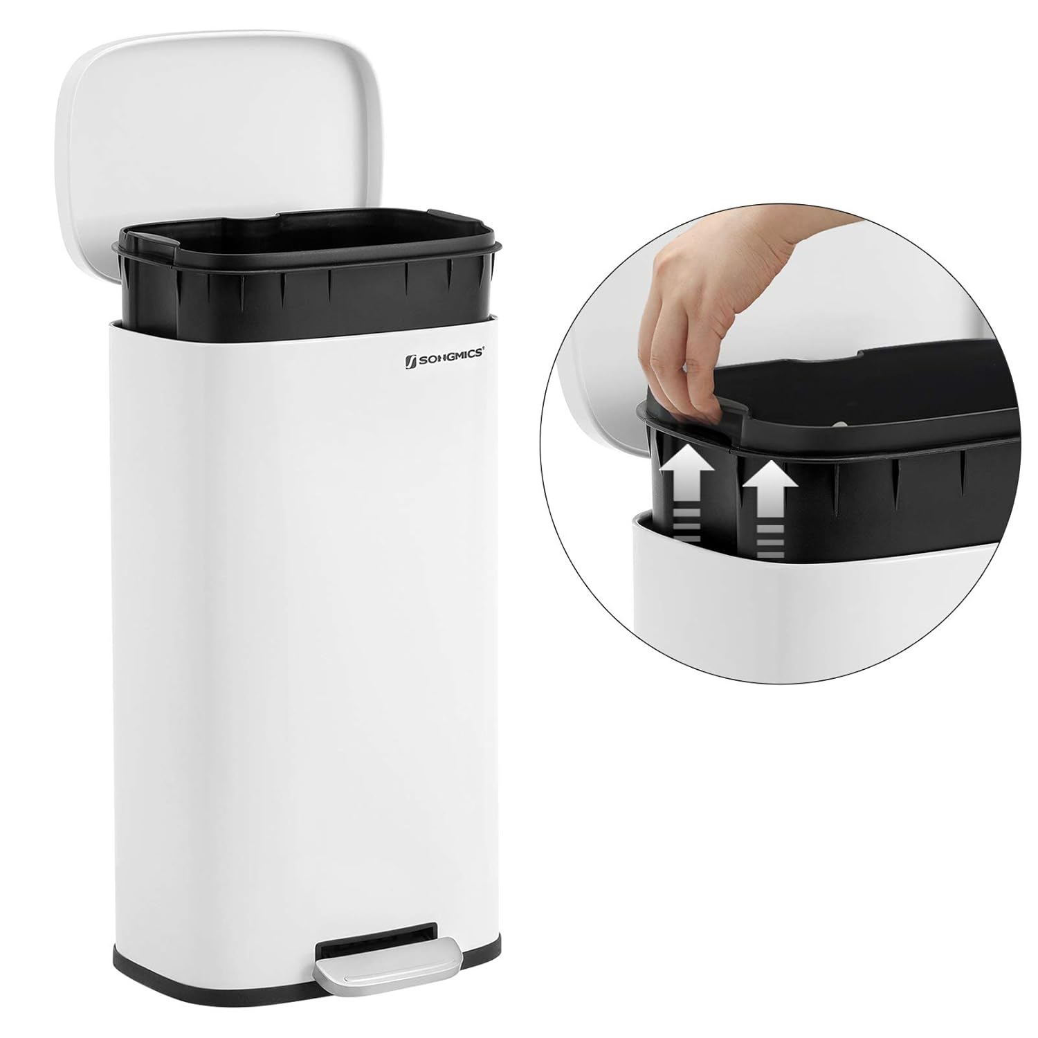 SONGMICS Trash Can with Lid, 8 Gallon Garbage Can, Stainless Steel Small Waste Bin with Step Pedal and Inner Bucket, Soft Close, Kitchen, White ULTB102W01