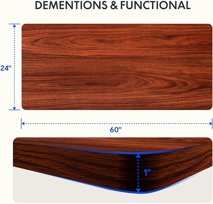 - AMPLE WHOLE-PIECE DESKTOP: With its whole-piece 1” eco-friendly desktop, this standing desk provides plenty of room for your computer setup, documents, and accessories, creating a well-organized and productive work environment. Due to hand measurements, desktop dimensions may vary slightly by 0 to 1”.