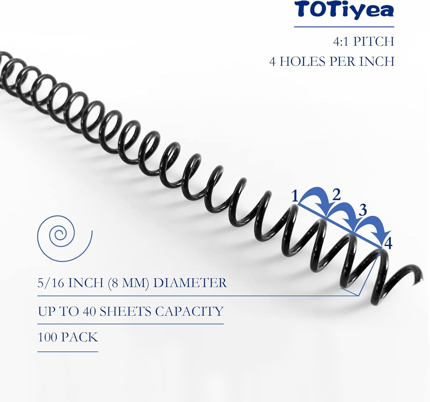 TOTiyea 100 Pack Plastic Spiral Binding Coils,8mm(5/16") Binding Spirals,40 Sheet Capacity,4:1 Pitch, Black