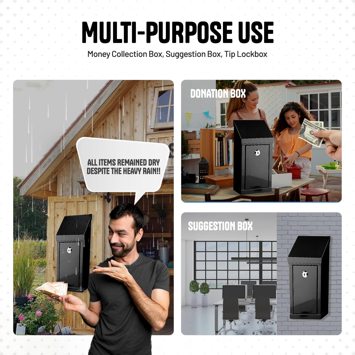 Metal Donation Box-Suggestion Box with Slot and lock-Cash Lock box for Money-Waterproof Drop Box-Comment and ballot voting box-comes with pre-drilled holes for easy wall mounting 10x6x2.5"(Black)