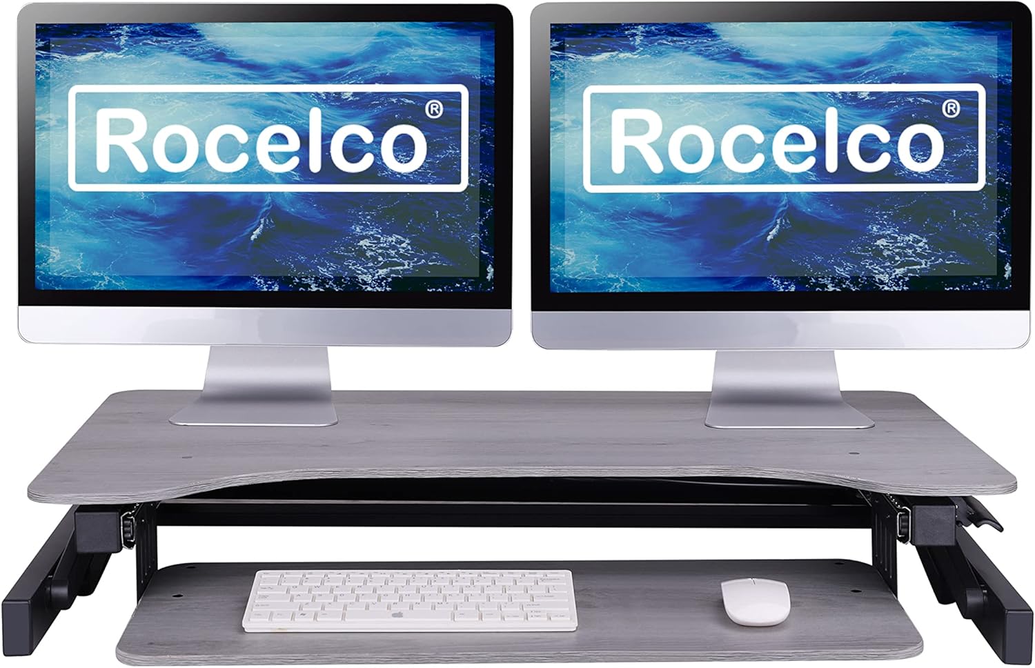 Rocelco 37.5" Height Adjustable Standing Desk Converter with Anti Fatigue Mat Bundle - Slide Out Retractable Keyboard Tray - Sit Stand Dual Monitor Riser - Computer Workstation - Gray (R DADRG-MAFM)