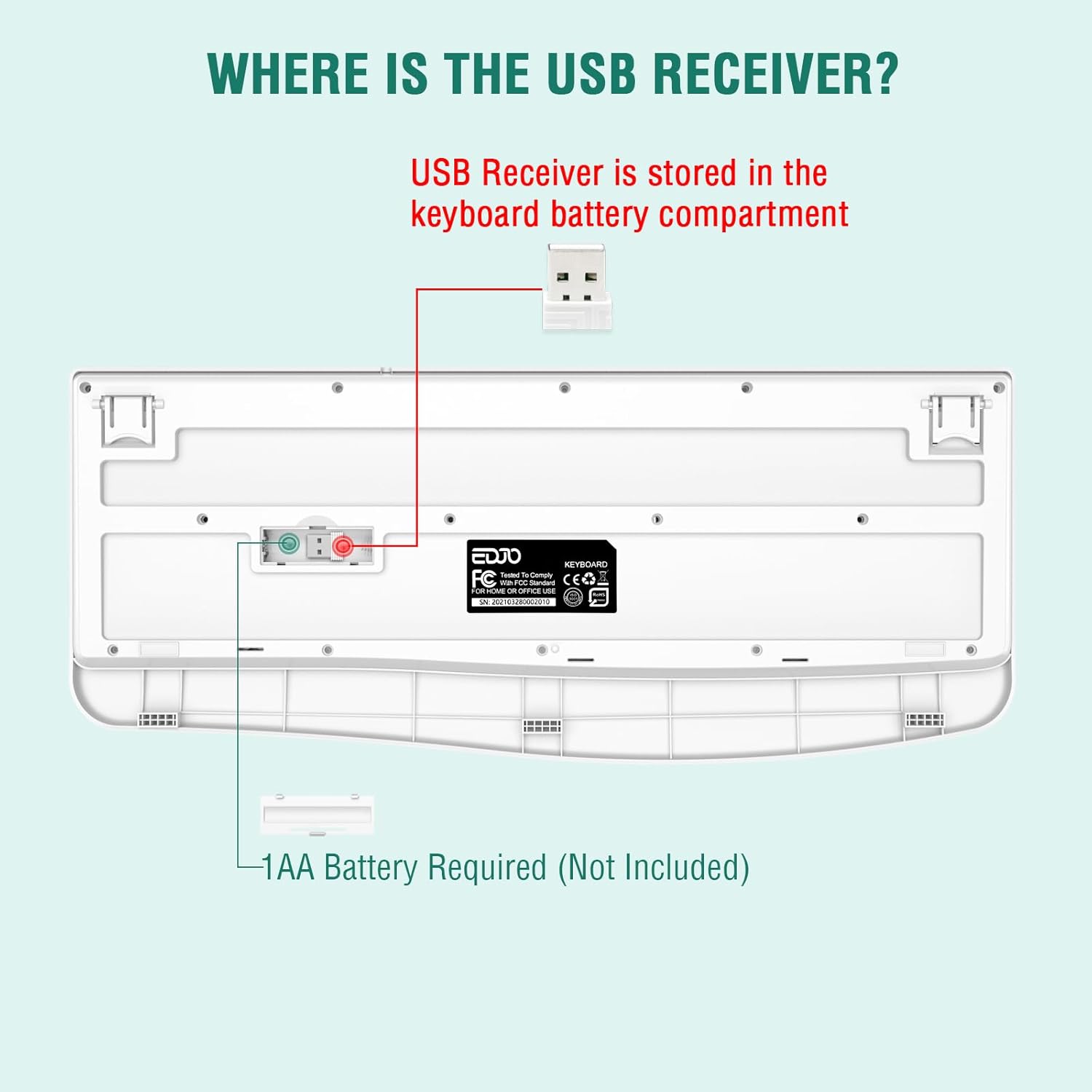 - 【Ergonomic Wireess Keyboard】EDJO Full-sized wireless keyboard is ergonomically designed with Palm Rest and folding holder that can keep it at an optimum slope, prevent your wrists from hurting while long sessions of typing. Keyboard is also designed with anti-slide pads so it will stay in place when you're typing quickly. Note: The USB receiver is in the battery compartment of the the keyboard, you can find it when open the keyboard battery cover.