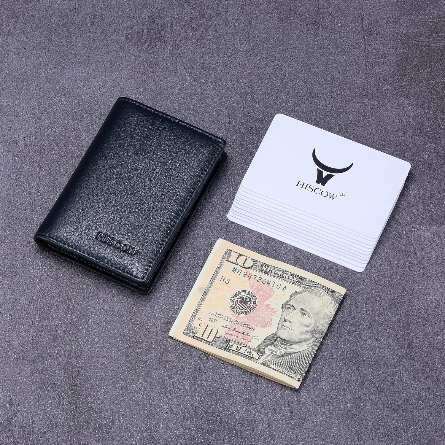 - What You Get: HISCOW Leather Business Card Holder, in an exact-fitting and classy matte-black box. Welcome guide, our worry-free 12-month warranty and friendly customer service