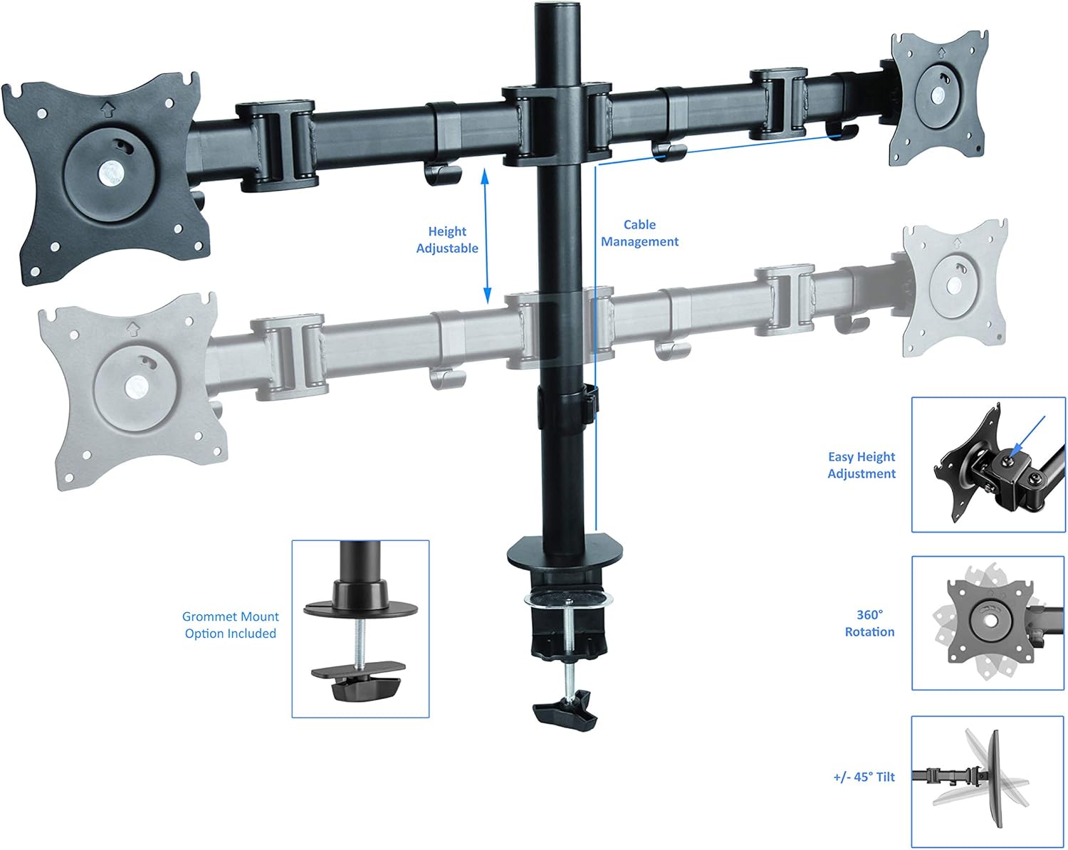 - GROMMET HOLE: For hassle free cable management, or to install a monitor mount for 1 or 2 monitors, such as the Rocelco DM2 or MA2.