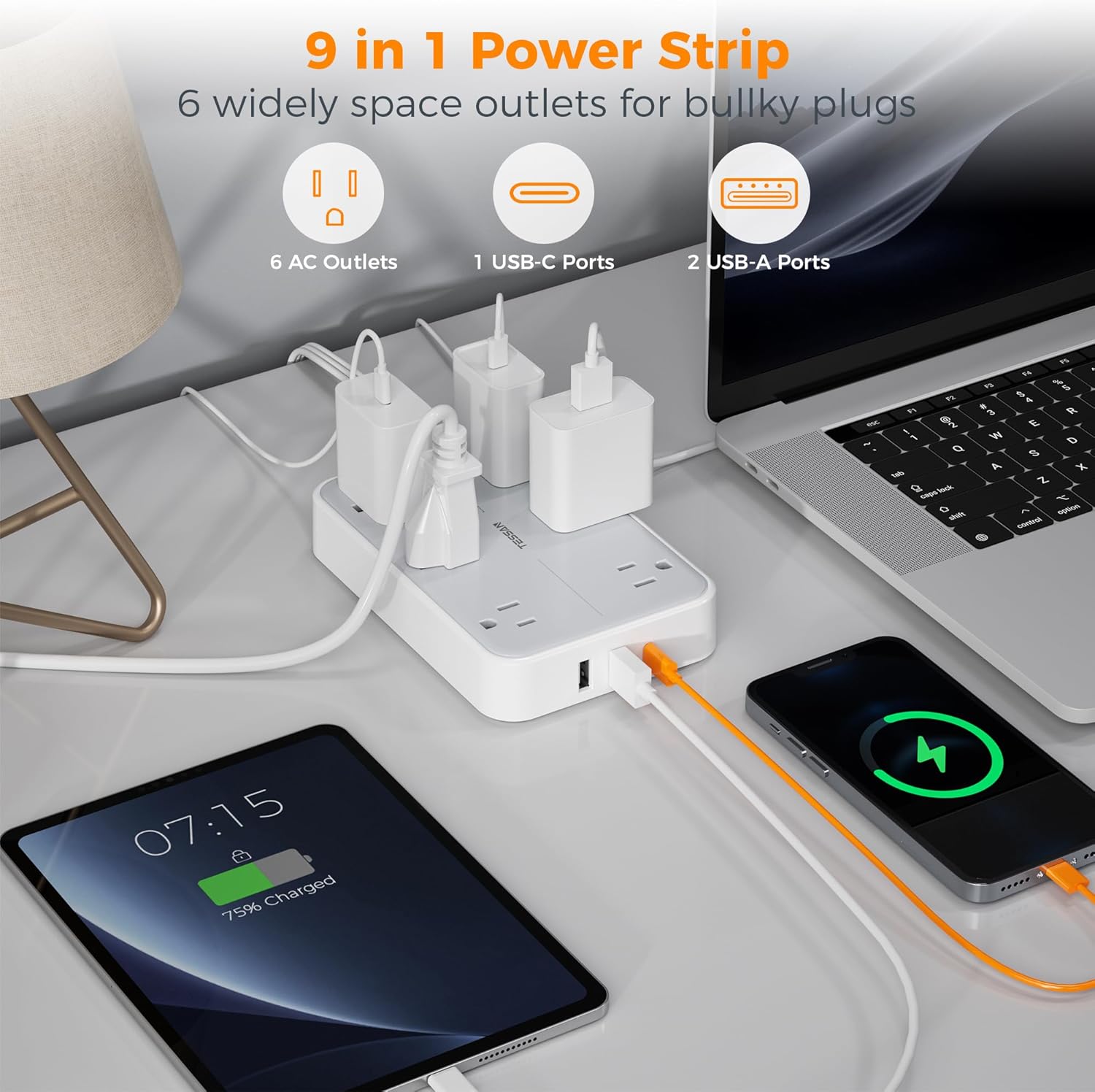 - 9 in 1 Flat Plug Power Strip: Power strip with USB ports 10 FT cord can be expanded to 6 AC Outlets, 1 USB C and 2 USB A; The USB C port is 3A (15W Max), and the USB A port is 2.4A (12W Max); 1080J surge protector power strip 10 FT cord is rated at 1250W to meet your charging needs in the dorm room, office, home, etc