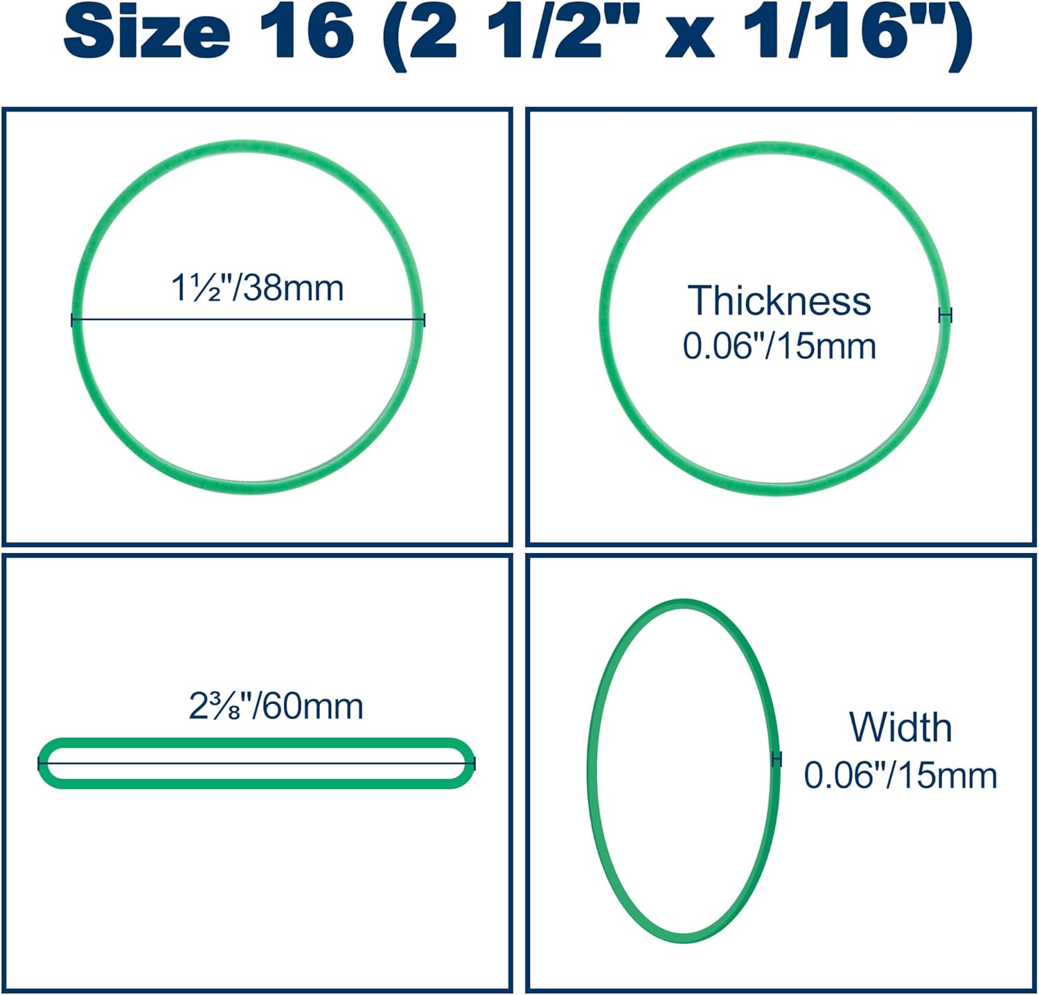 - Size16: 2 1/2" x 1/16". Each band measures 2.37 inches (60mm) in length, 0.06 inch (15mm) in width, and 0.06 inch (15mm) in thickness