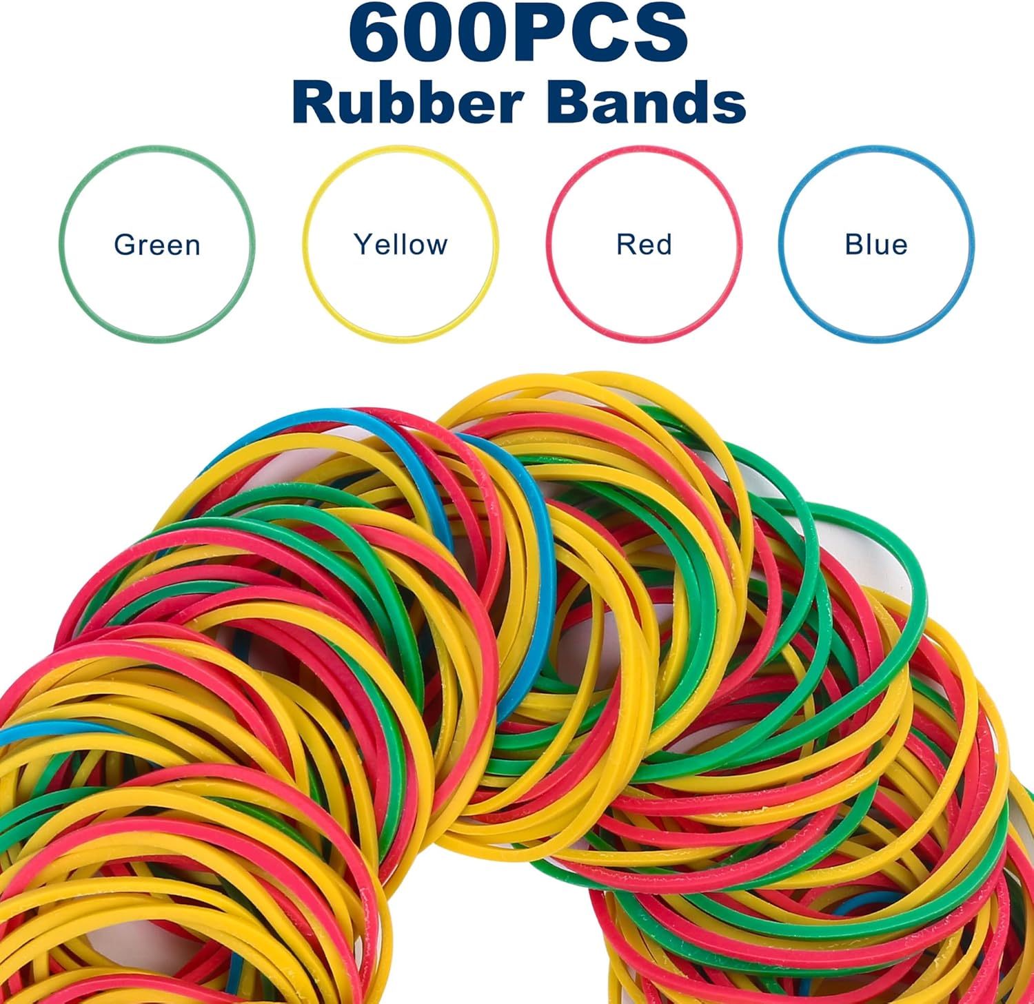 - Variety Pack: This set includes 600 rubber bands in assorted colors - red, green, blue, and yellow