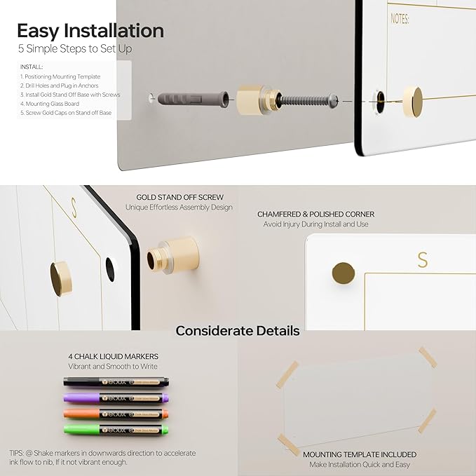 - MILD LUXURY & TOP QUALITY | Add a mild luxury tone to your home or office with this glass weekly dry erase board. Featuring a gold printed weekly planner layout on a frameless ultra white tempered glass with gold mounting hardwares. The scratch resistant & stain non-absorbent glass provide lifetime durablity & best erasability, a great upgrade from acrylic and other old-fashioned white board surface.