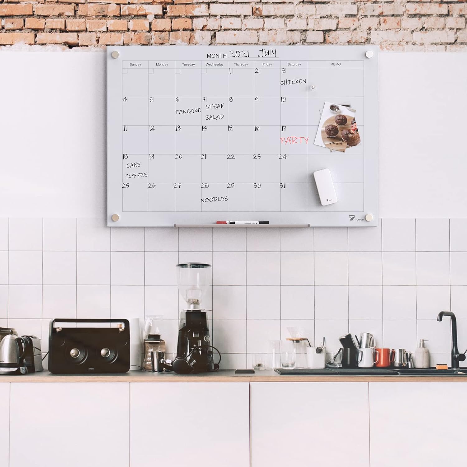 TOWON Tempered Glass Calendar Dry Erase Board for Wall, 3' x 2' Magnetic Whiteboard Calendar Planner for Office, Home, School Supplies, White, 36 x 24 Inches