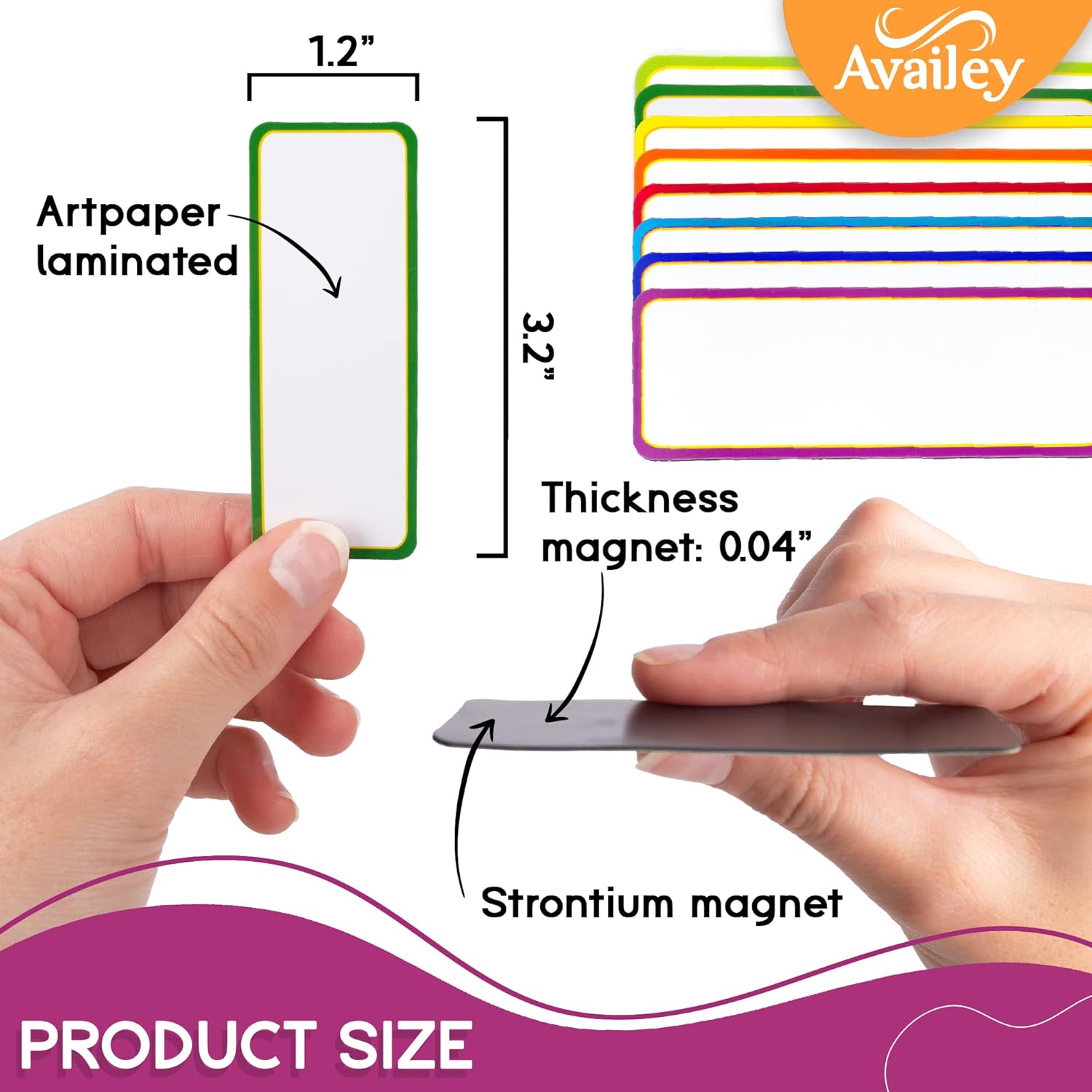- High-quality Material: The magnetic dry-erase labels have a white writable front with a colored edge, made of laminated art paper, dry-erasable, and a 0.04 inches thickness strontium magnet, on the back for a powerful adhesion to various surfaces; Each label measures 3.2 x 1.2 inches;
