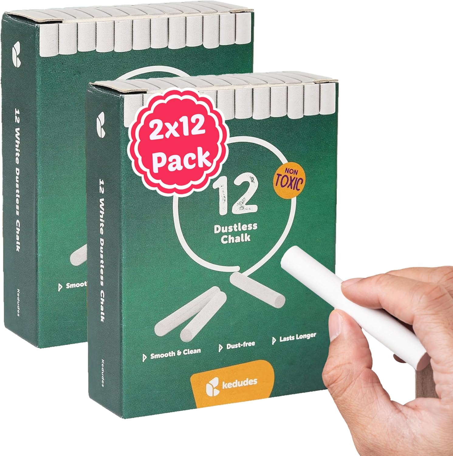 kedudes White Chalk - Chalkboard Chalk for Classrooms and Home - 24 Sticks of Dustless Chalk - Smooth Writing, Easy Cleanup - Suitable for Kids, Teachers, and Creative Spaces - 2 Boxes