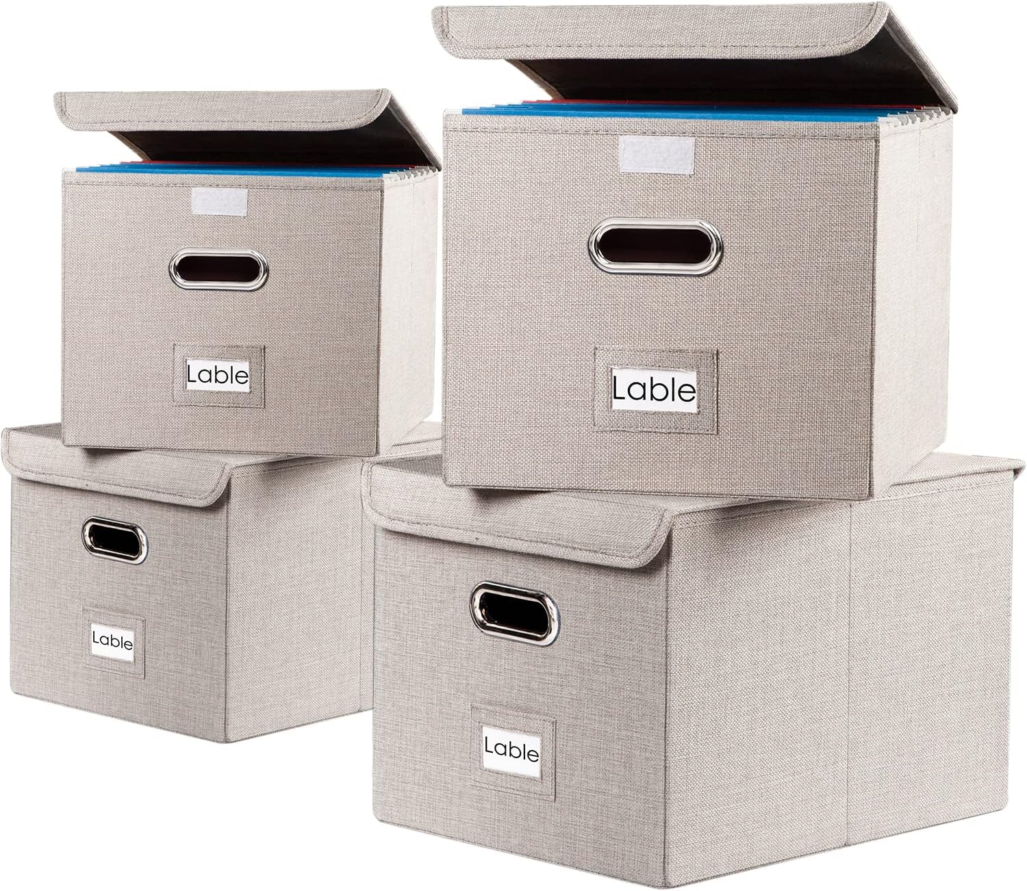 PRANDOM File Organizer Box - Set of 4 Collapsible Decorative Linen Filing Storage Hanging File Folders with Lids Office Cabinet Letter Size Light Grey (15x12.2x10.75 inch)