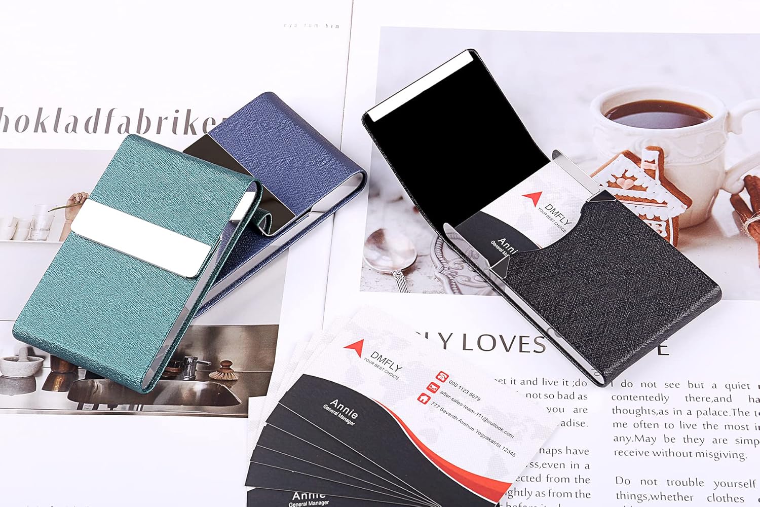 - DMFLY leather business card holder case - Perfect purse size and classy looking, let you feel confident pulling it out of your pocket and handing somebody a card.