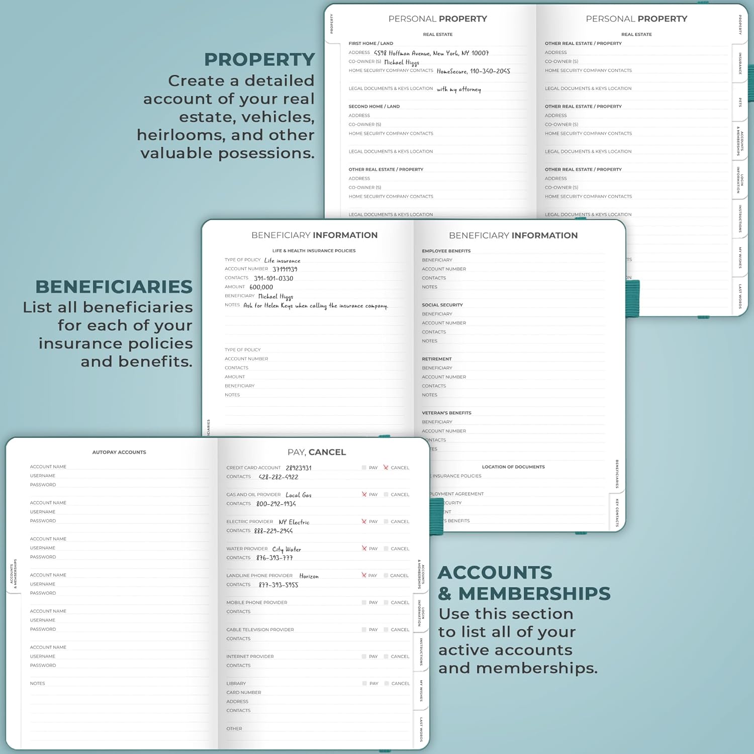 - MEDICAL & FINANCIAL INFO, INSURANCE POLICIES, ACTIVE MEMBERSHIPS & MORE: Inside this funeral planning workbook, you can add care instructions for dependents and pets, personal property, finance & business info, insurance policies, beneficiaries, and more.
