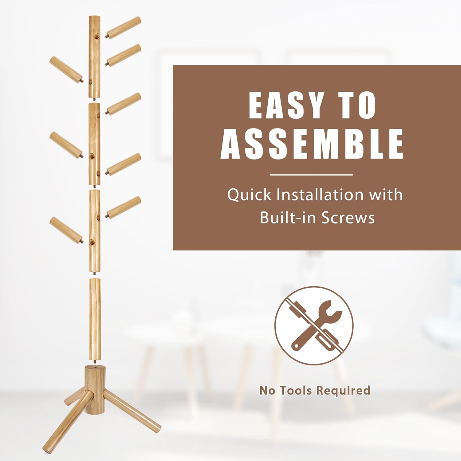 Haddockway Wooden Coat Rack Stand with 8 Hooks New Zealand Pine 3 Adjustable Coat Standing Tree Easy Assembly for Coats, Hats, Scarves and Handbags for Entryway, Hallway, Bedroom, Office