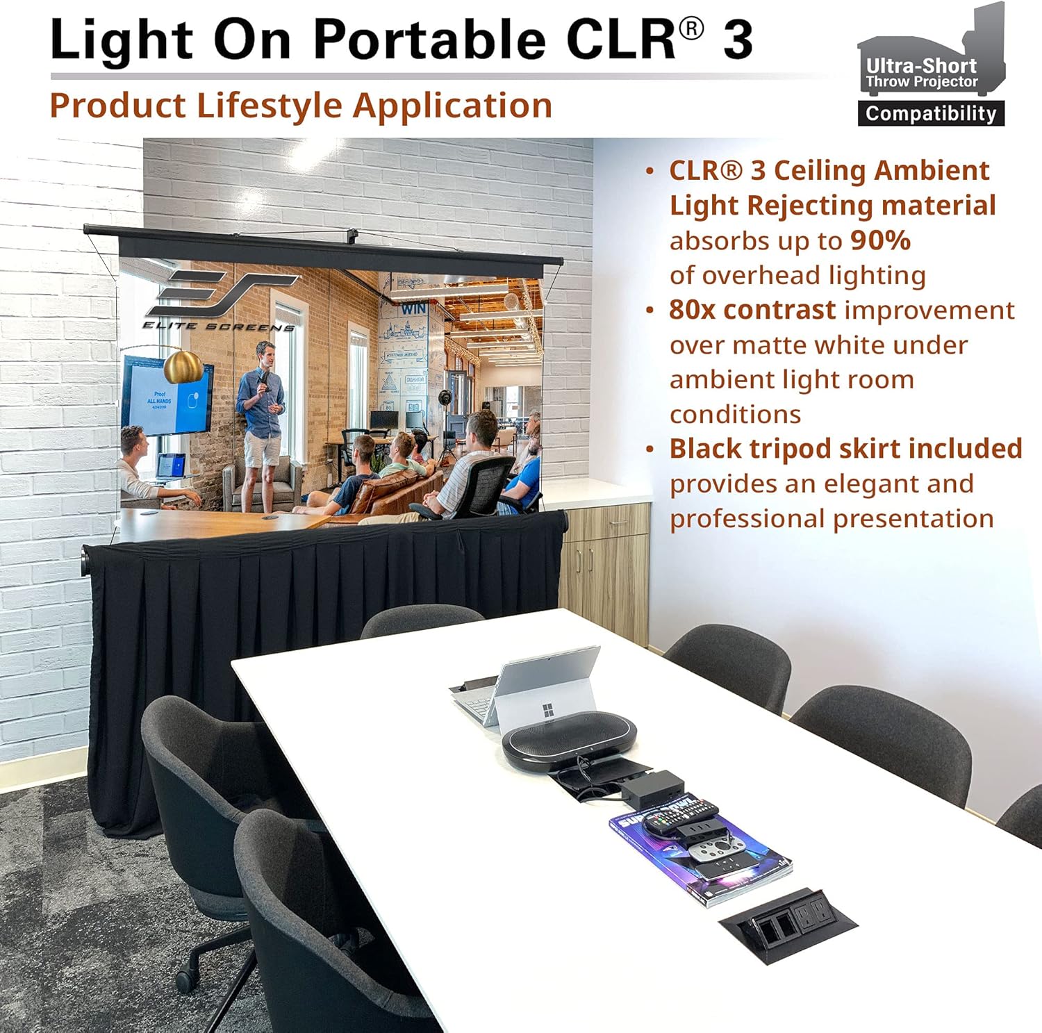 - Screen Material: CLR 3, Ceiling Ambient Light Rejecting (CLR/ALR) Technology Features a 170° Viewing Angle with 0.8 Gain - Exclusively for Ultra-short Throw (UST) tabletop/bottom mounted projectors – 4K/8K Ultra HD and Active 3D Ready. Rejects 90% of Overhead Light while Enhancing Contrast 75x Compared to Standard Matte White Screens.