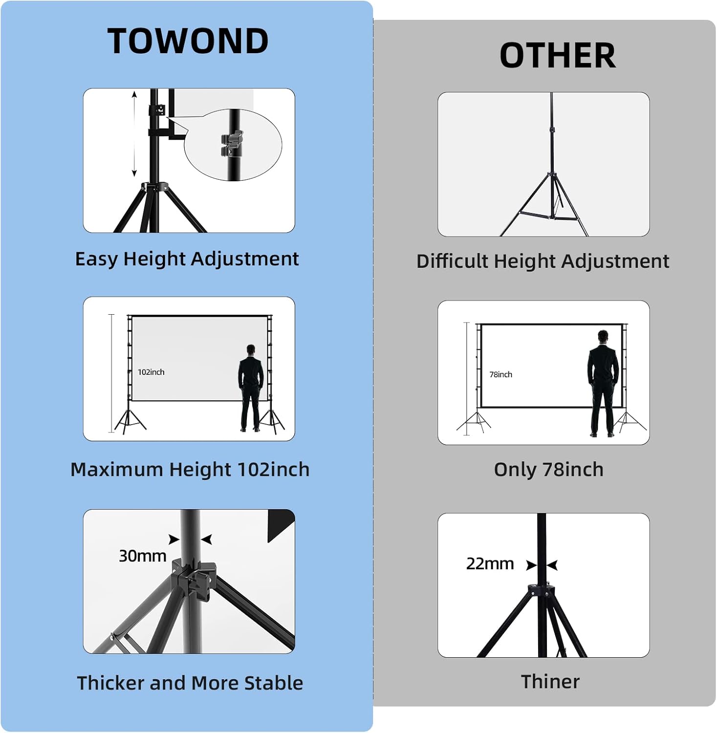 - Projector Screen with Stand. 150-inch diagonal, 160°wide viewing angle, aspect ratio 1:1 and 16:9 4k HD portable projector screen is made of high quality natural polyester fiber. Towond projector screen offers sharp and bright images. Thick and anti-crease design giving you more fun, even support FRONT and REAR projection.