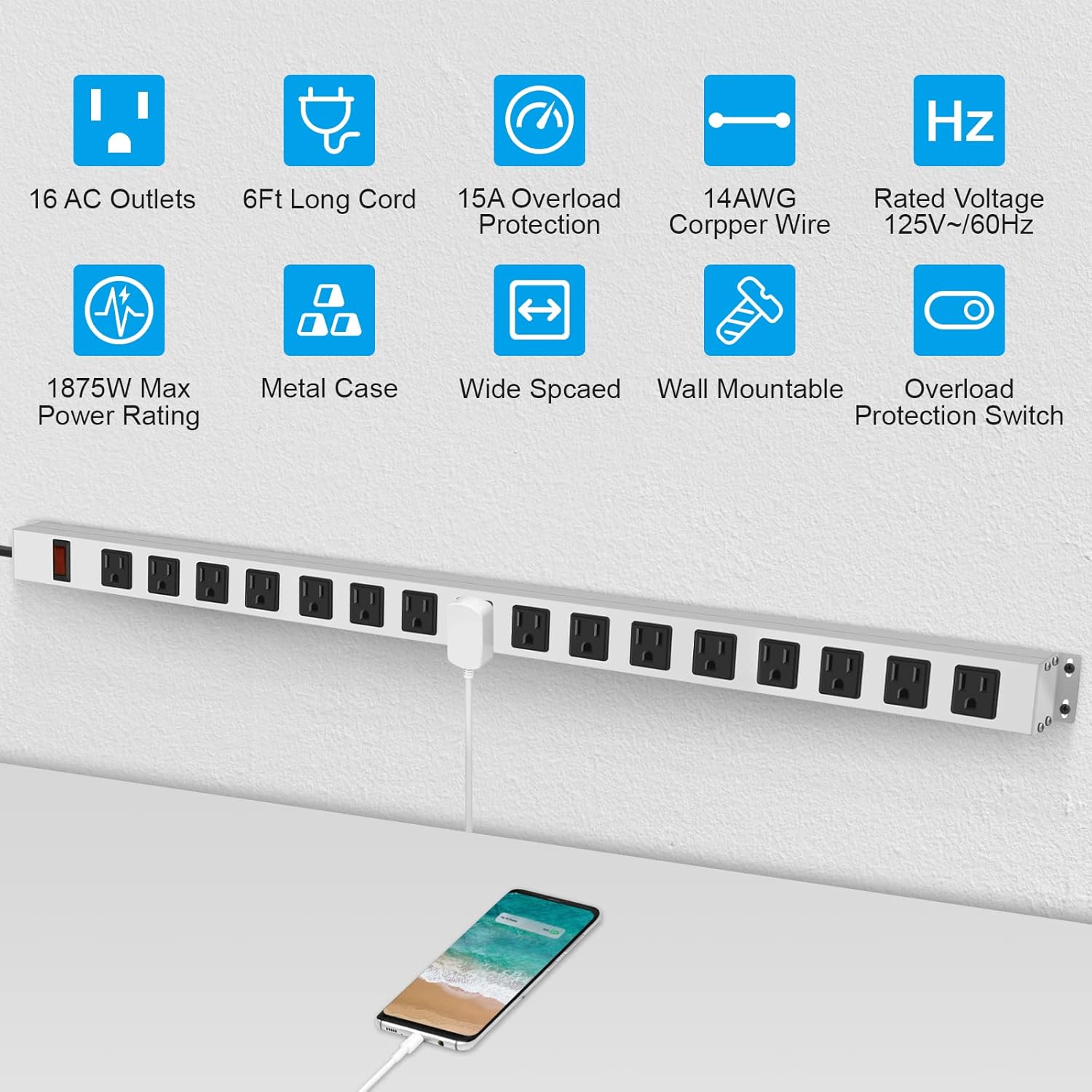 - Long Power Strip 16 Outlet: Providing enough space between the sockets to accommodate big plugs. heavy duty surge protector was connected with 6ft 14AWG/3C power cord, Equipped with 15A high current, Max: 60Hz/125V/15Amp/1875W.