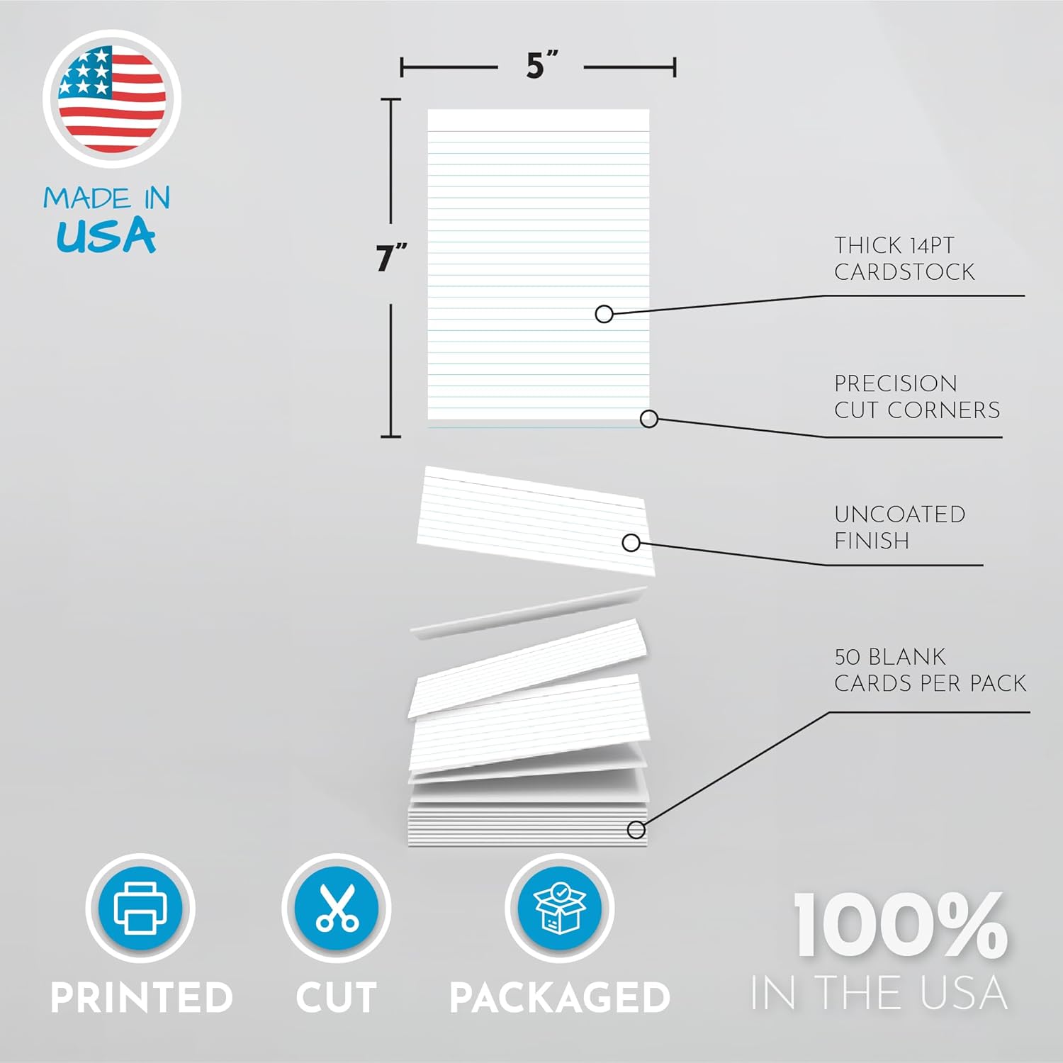 - DETAILS: (50 pack) 5” x 7” double sided, blue lined note cards with header portion at top of card. Lines printed on thick 14PT heavy duty un-coated white card stock paper for writability.
