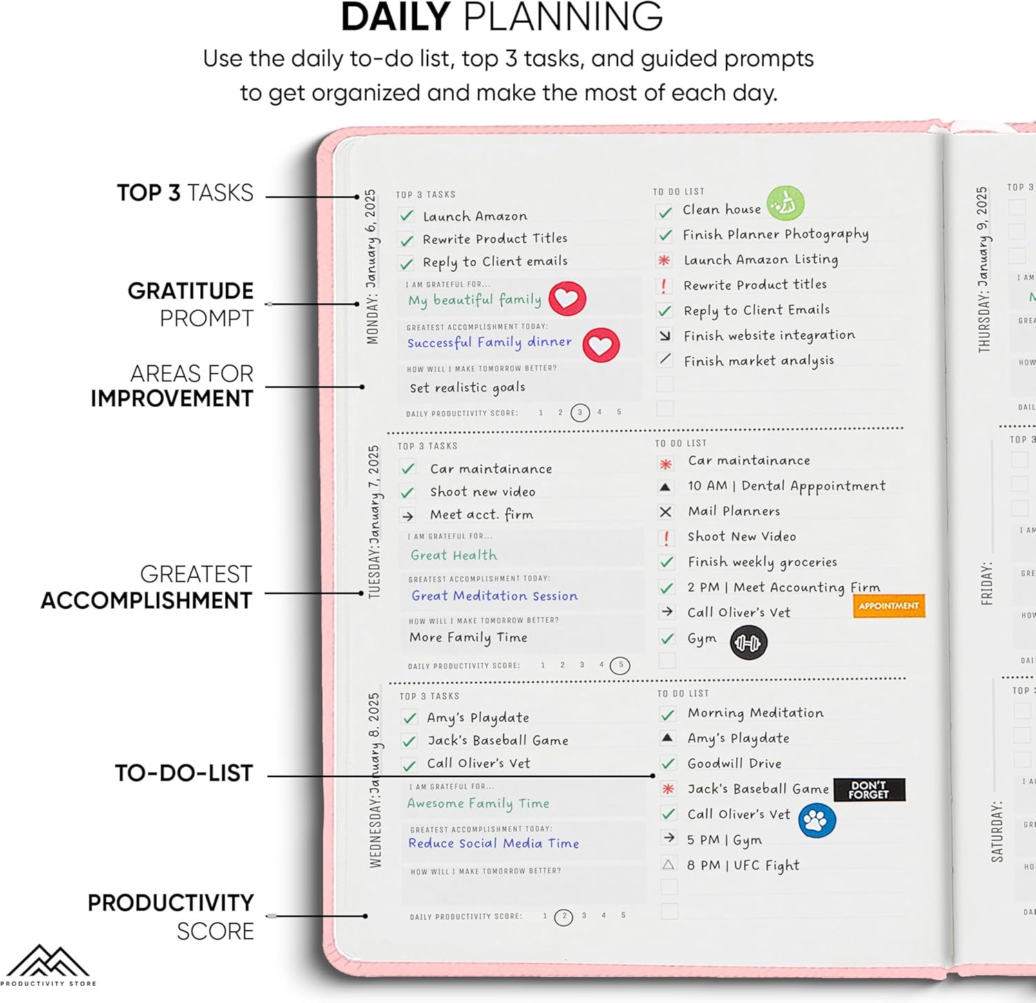 - ✅DAILY GRATITUDE JOURNAL & ACCOMPLISHMENTS: Start each day focusing on the positive and becoming more mindful. Our planner journal includes daily gratitude prompts designed to increase happiness, improve relationships, and develop a positive mindset. Use the Daily Productivity Score feature to rate your daily performance and reflect on ways you can improve the next day. It's one of the best motivational gifts for women or men available.