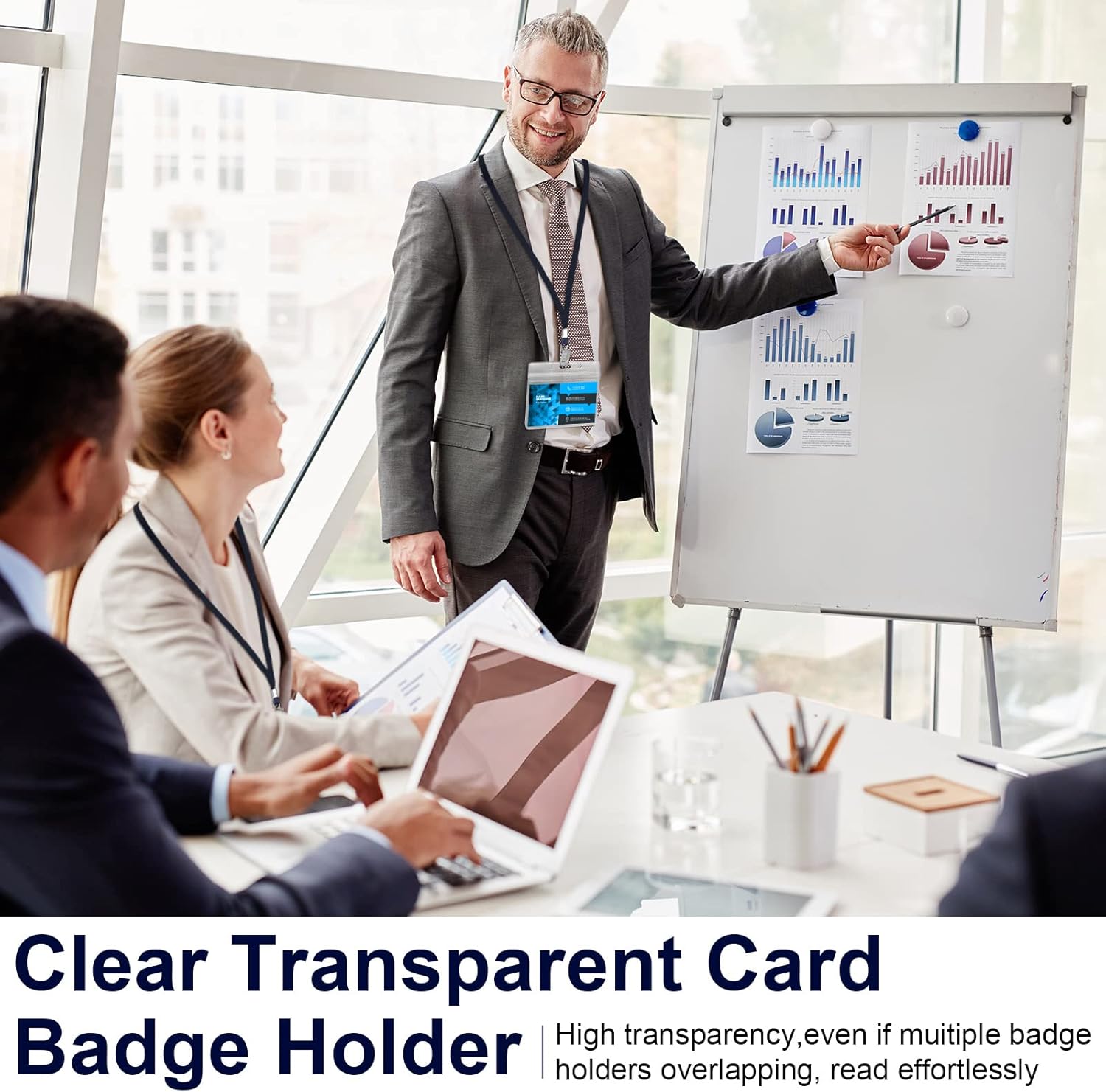 Marspark 100 Sets Clear Name Tags with Lanyard, Lanyards for ID Badges Reusable Strap with ID Holder Plastic Name Badges for Adults Business School Church Conference (Dark Blue)
