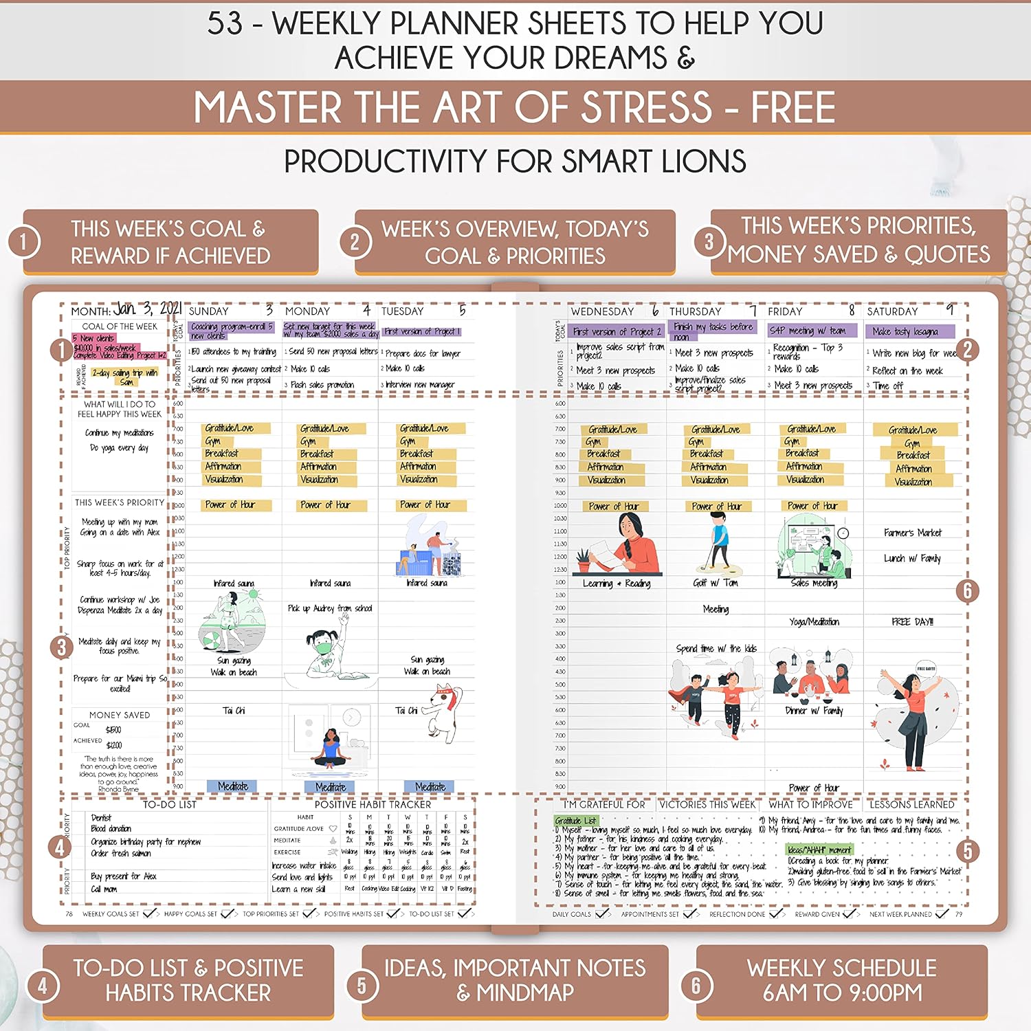 - LIFE PLANNER - A5 Size, 212 pages of life transformation, 53 weekly, 12 monthly planning overviews & reflection, 22 dotted journal pages, habit trackers, mind maps, morning & evening routines, inner pockets, pen holder & gift box