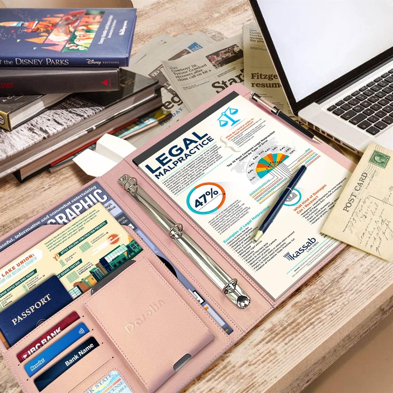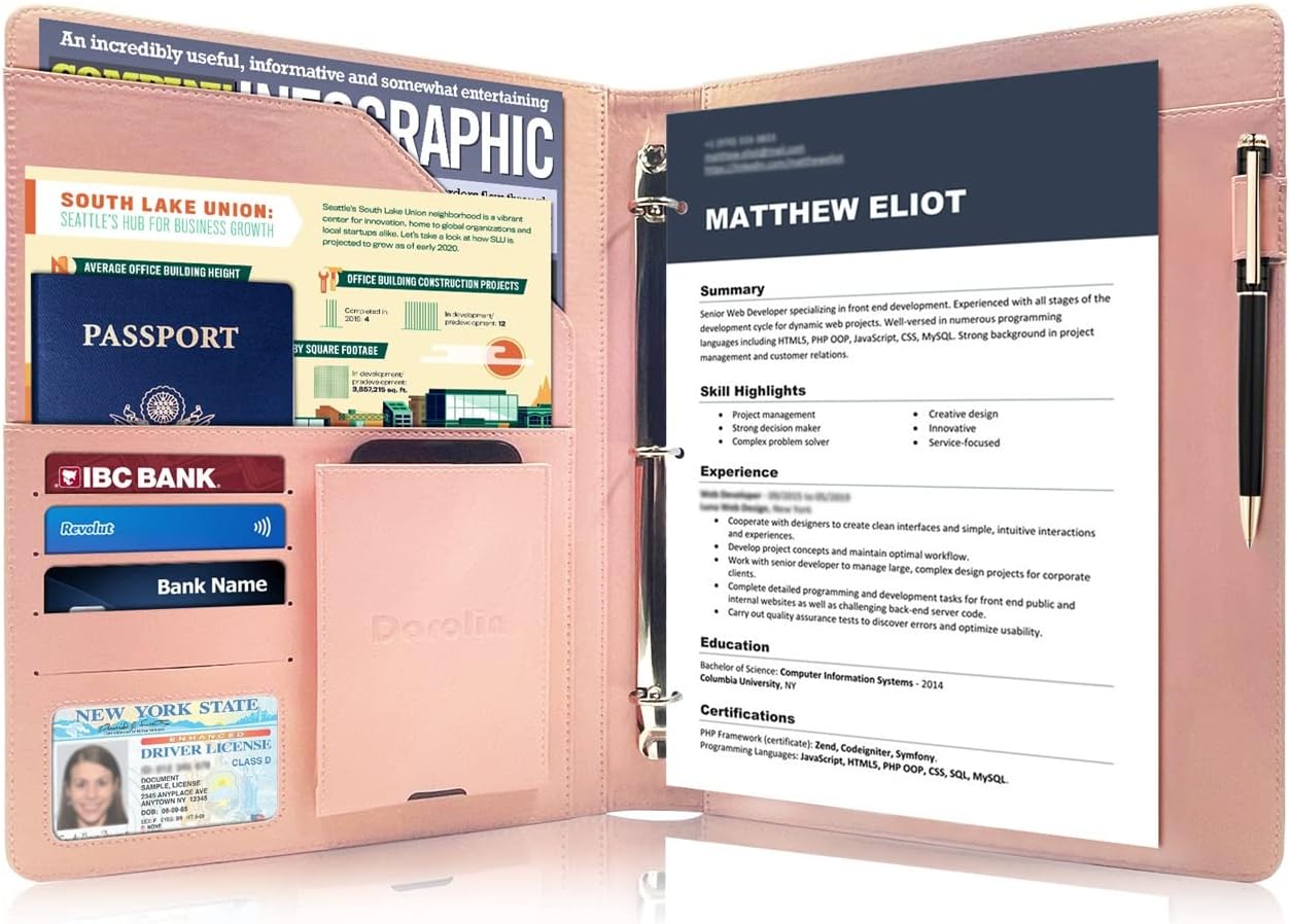 - [PRACTICAL & ORGANIZED] Darolin Portfolio Binder 3 Ring case designed with one Stainless Steel 3 Ring Binder, Pen Loop, Cell Phone Holder, File pocket, Bill Pocket and 4 Card Holders. Various inside pockets and slots capable of holding documents, letters, notes, envelopes, mobile phone, pens, business cards and other stuffs, which facilitate your daily use and business travels, make your work or study more efficient, which brings great convenience in daily life.