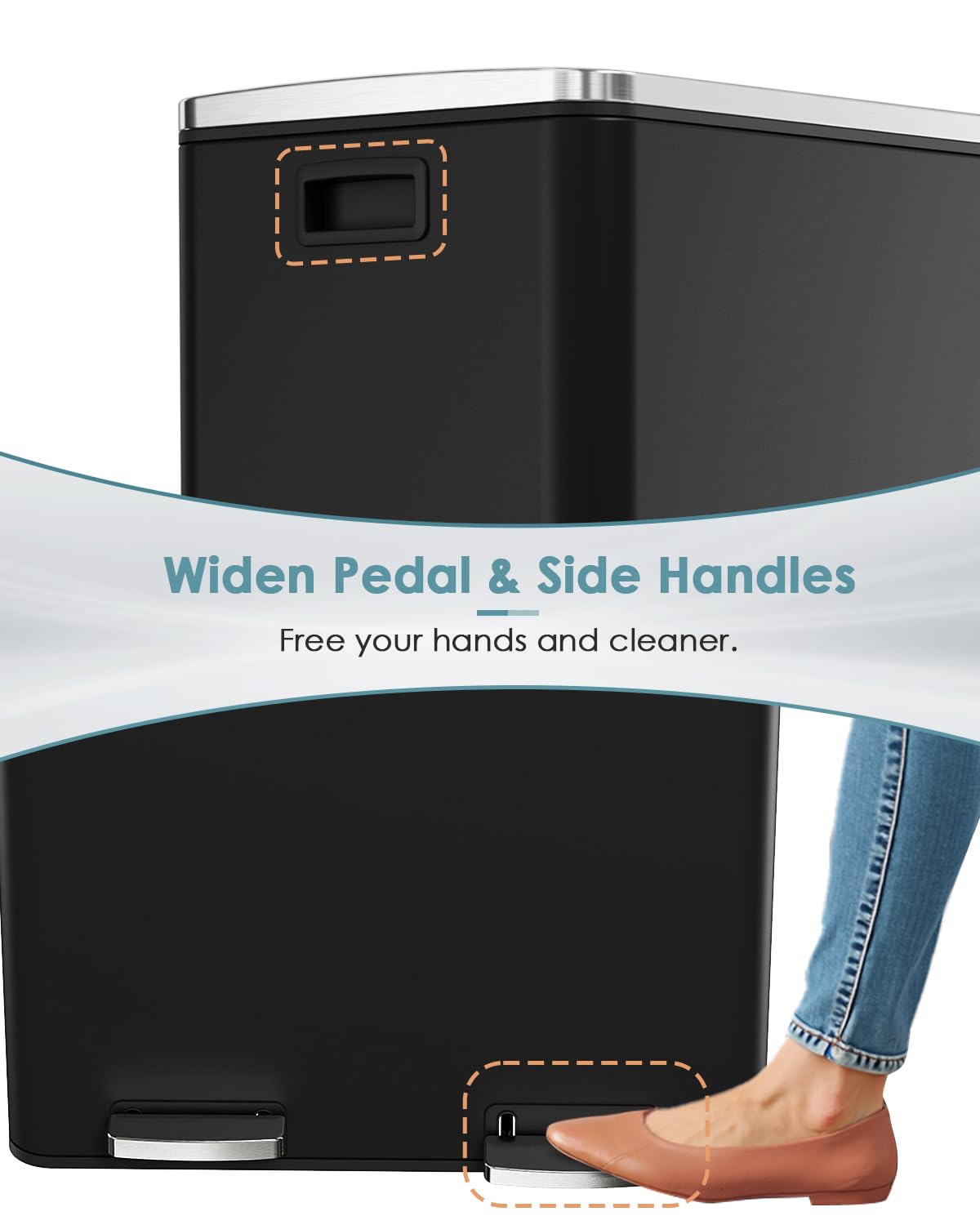 - THICK & WIDE PEDEL: Wide and thick stainless steel pedal is ergonomically designed, so you can throw out trash without bending over, and you don't need to touch the lid of the bucket when throwing out trash.
