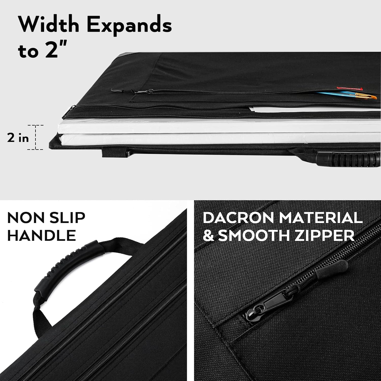 - Multiple Pockets for Organization: The portfolio bag features multiple pockets to organize artwork, supplies, and accessories efficiently. This allows artists to separate different pieces or materials within the bag, preventing them from shifting or becoming damaged during transit. Tips: 24" x 36" means it fitting to a 24" x 36" canvas