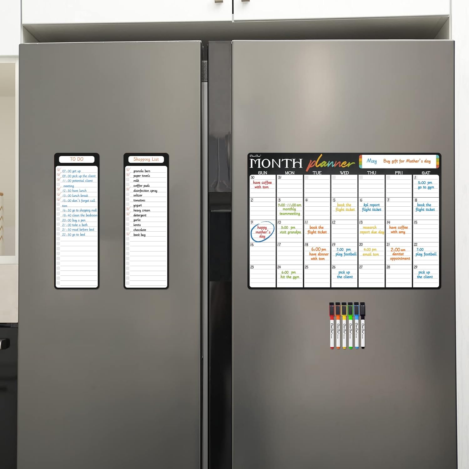 Magnetic Dry Erase Monthly Calendar - 17"x12" Monthly Calendar for Fridge - 4"x12" List Board 2 Pcs - 6 Extra Fine Point Markers Included - Shipped Flat
