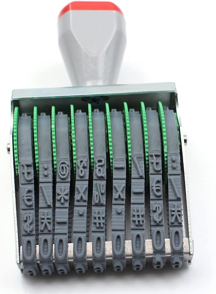 - 9 Digits Rubber Number Stamp, There are a total of 9 plastic wheel rotating belts. The rotating belt contains ten Arabic numerals from 0 to 9 and some symbols. Each rotating belt can be freely rotated, and you can manually arrange the numbers or symbols you want. Arabic numerals have 0-9 (10 digits) and symbols.
