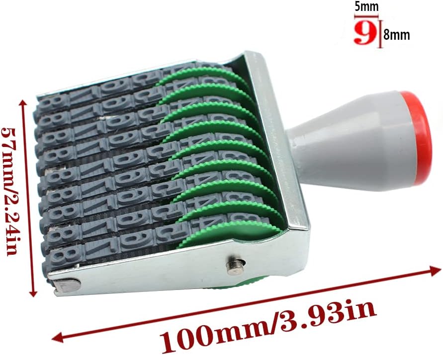 - Rolling stamp,: Material : Metal/Plastic. Size:Length :100 mm/3.93 in, Width:57 mm/2.24 in,High:25 mm/0.98 in,Character : Width:5 mm /0.19 in,Height:7 mm/0.27 in, Color : Gray black,Weight: 75 g. Package Content : 1 X Numbering Stamp(Without ink Requires a separate ink pad).